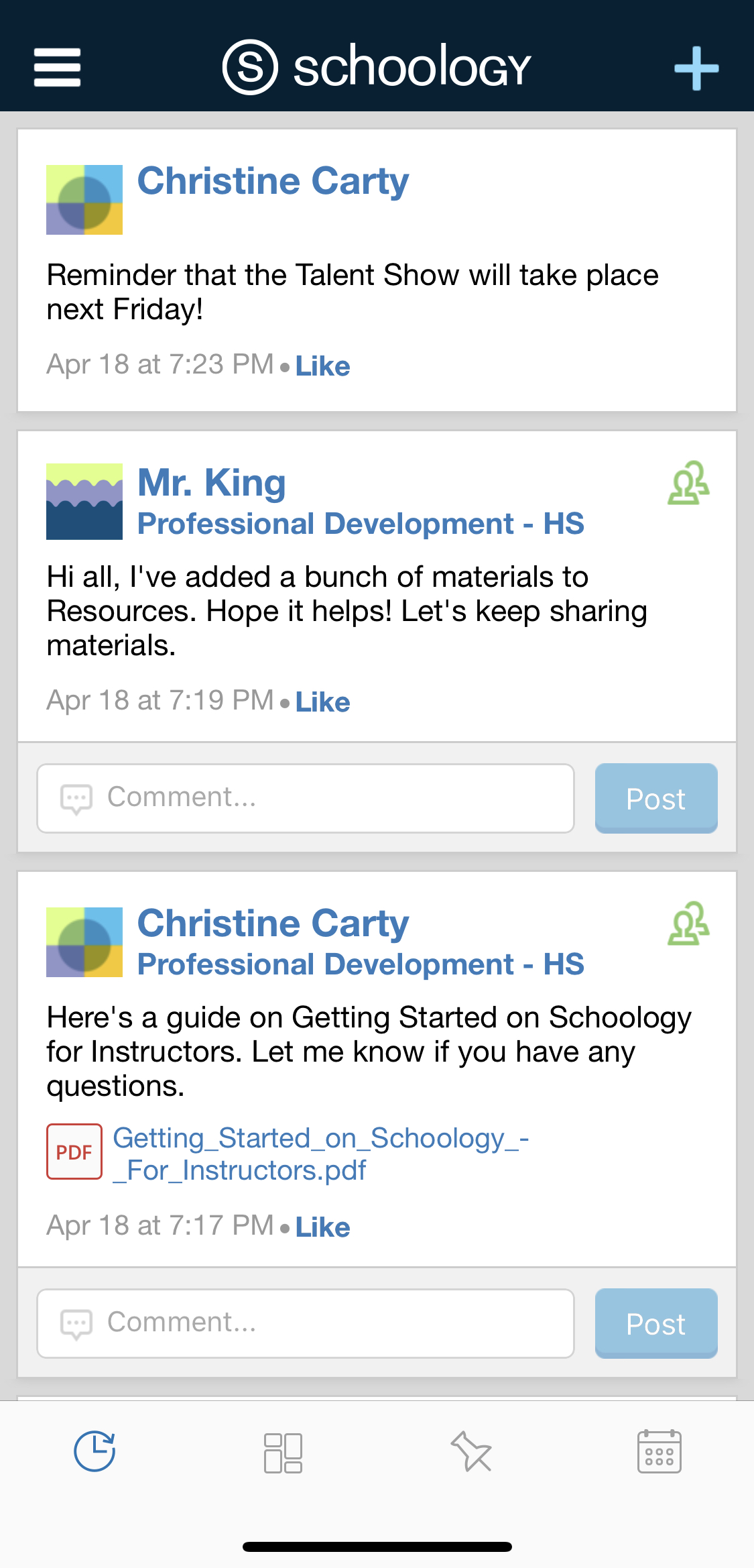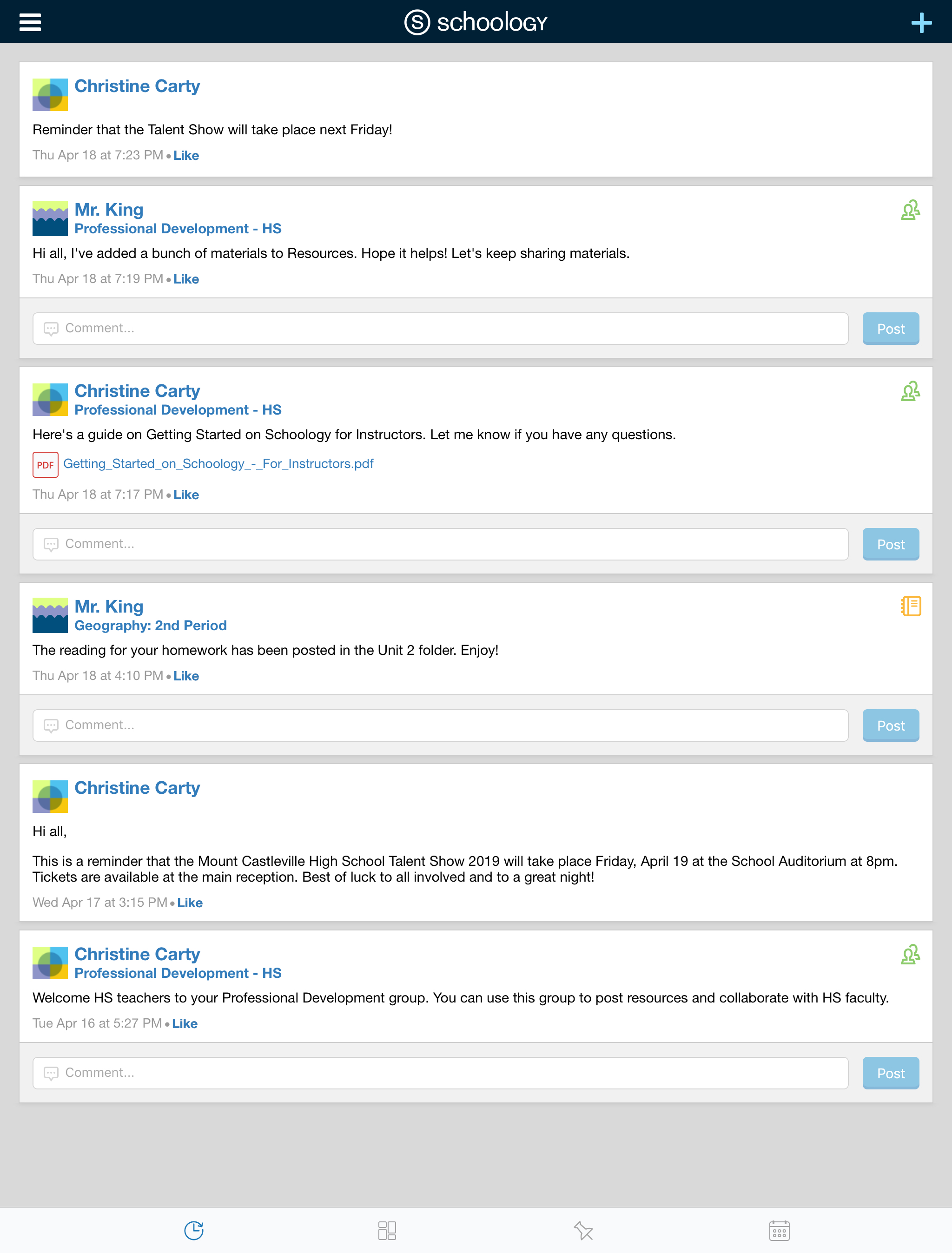 El área Actividad reciente muestra todas las actualizaciones más recientes y las publicaciones de blog que aparecen en la página de inicio de Schoology. Para acceder al área Actividad reciente, pulse el icono de reloj ubicado en la parte inferior de la Pantalla de inicio.