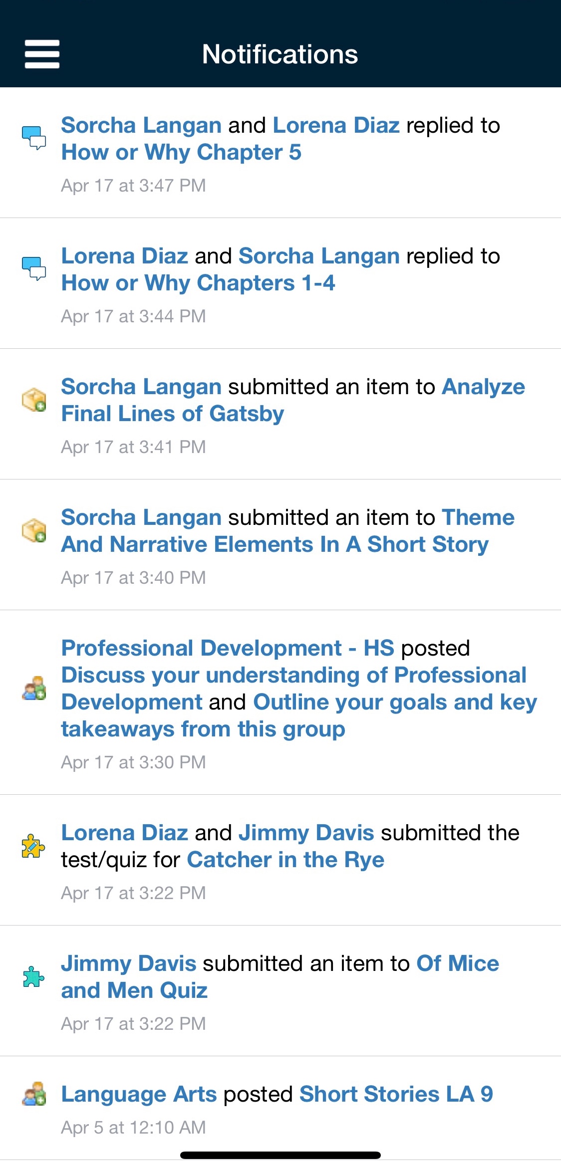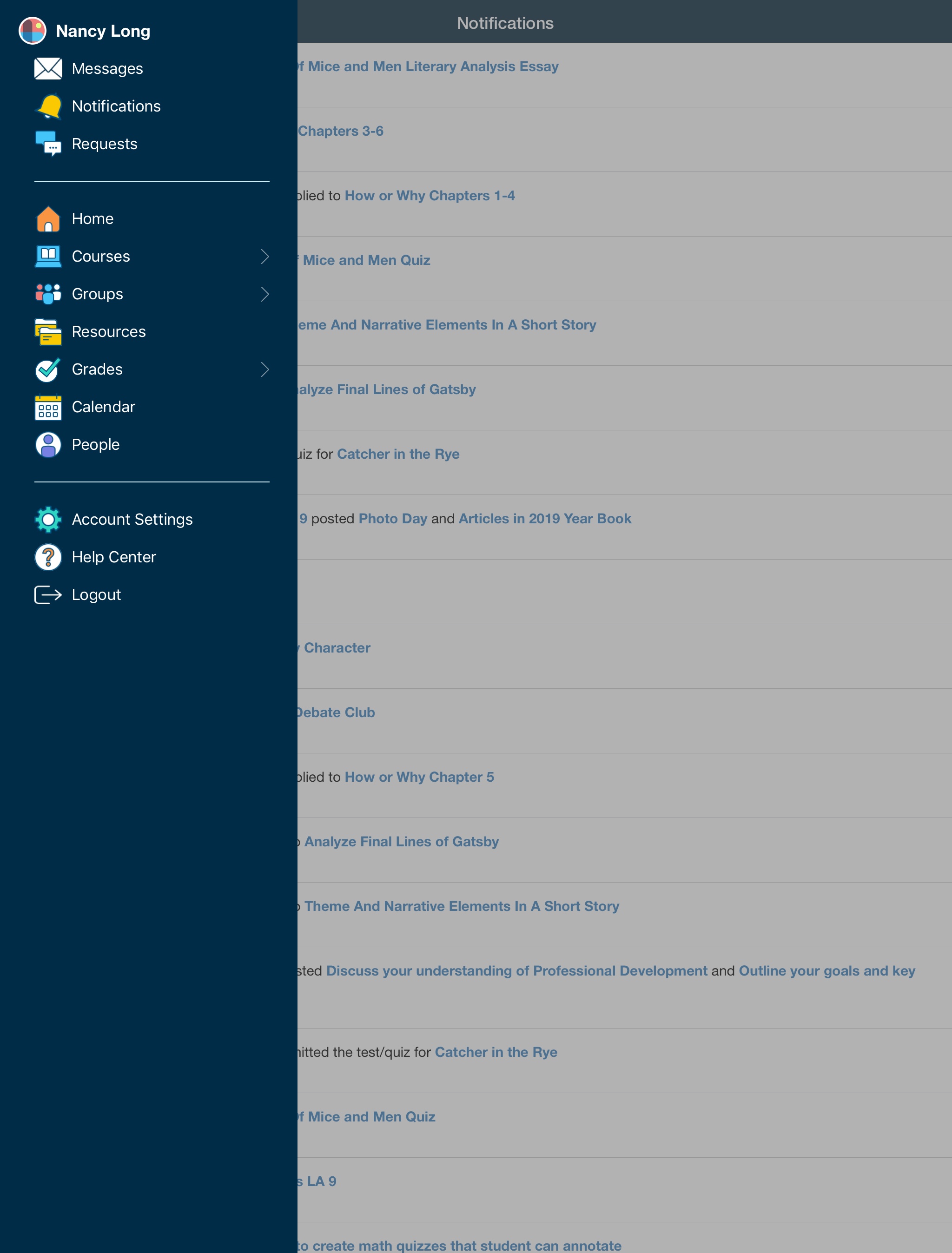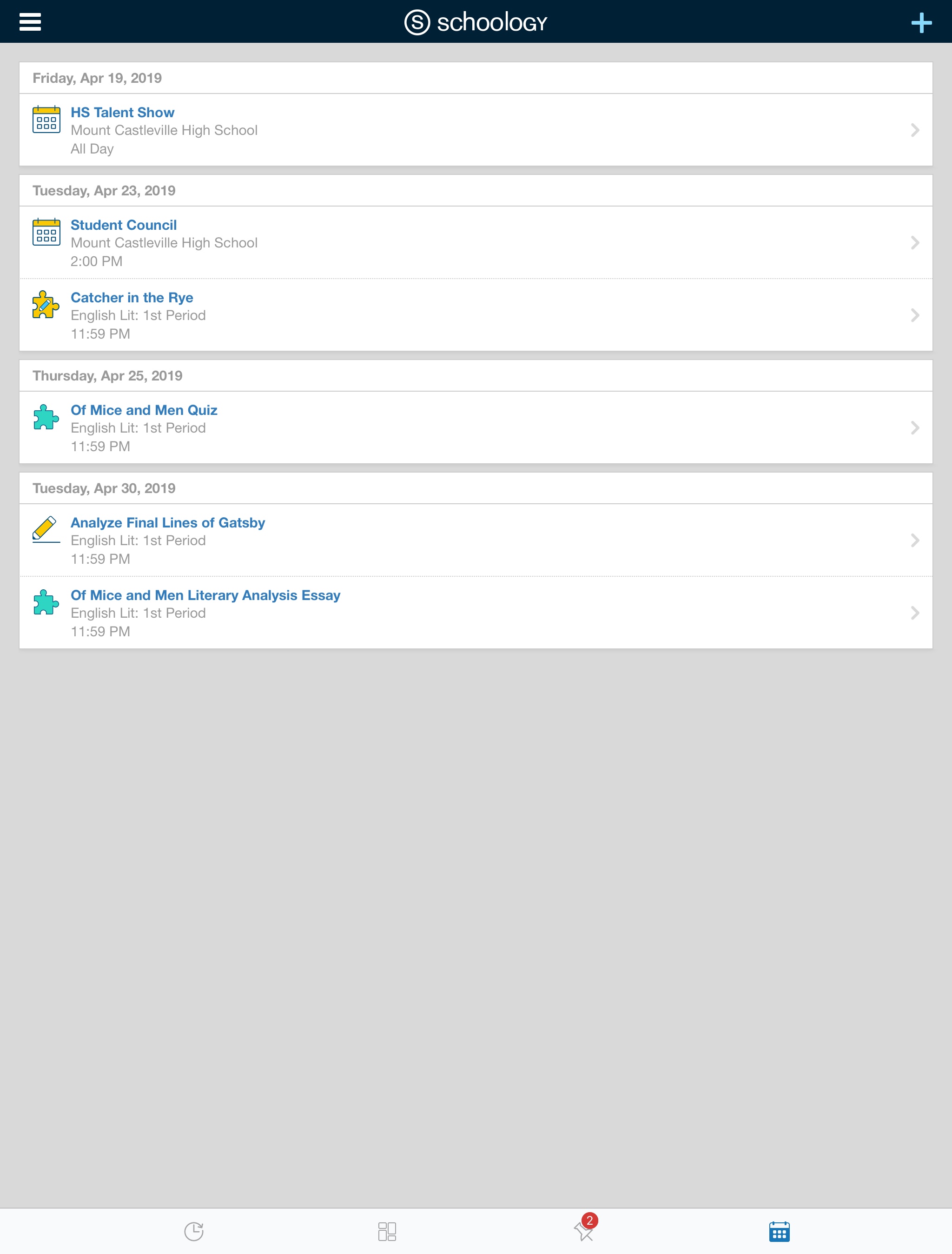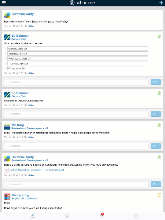 Schoology le envía notificaciones electrónicas sobre las actividades sociales, académicas, del grupo y del centro educativo que se producen en su cuenta. Si desea obtener más información sobre las notificaciones en la aplicación iOS de Schoology, consulte Notificaciones.