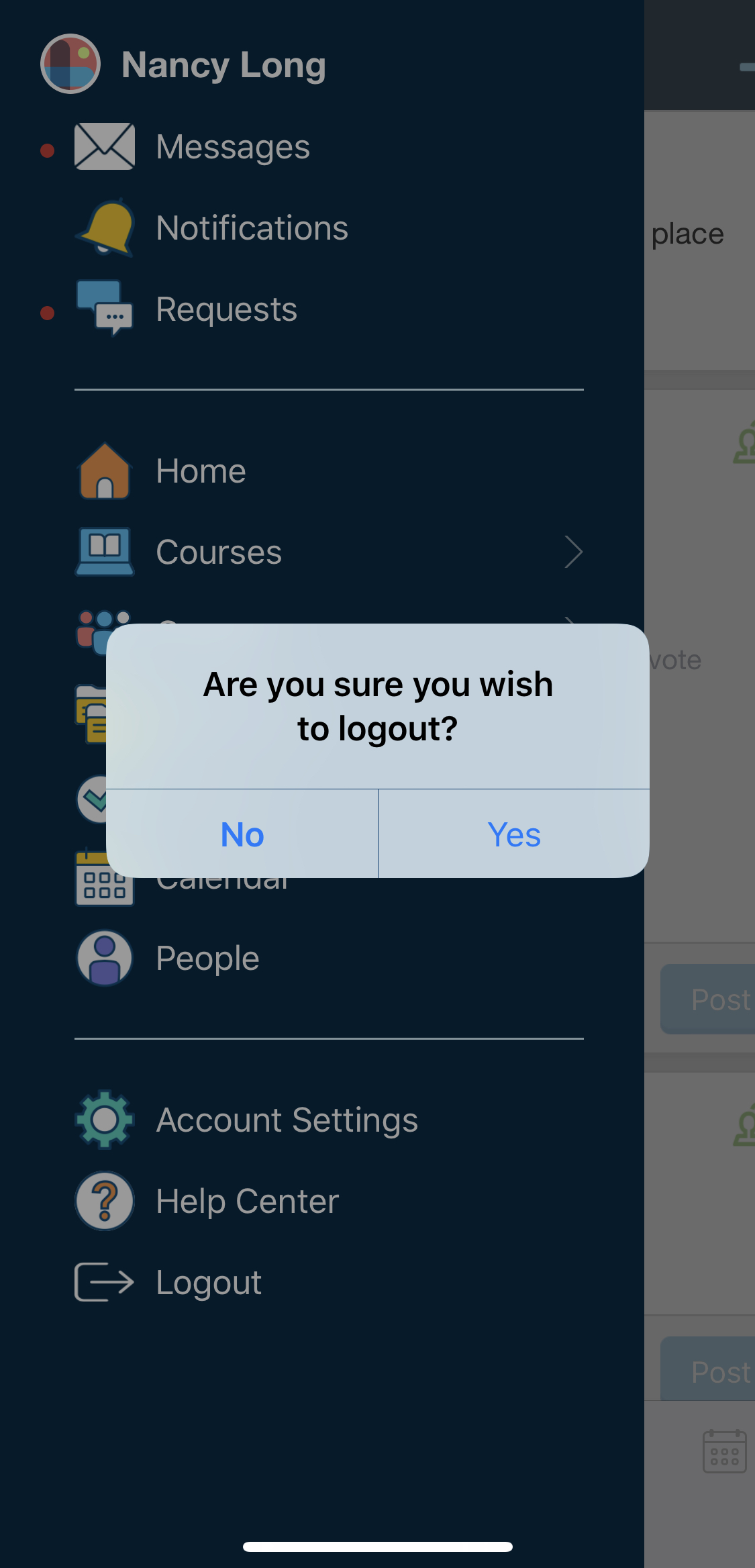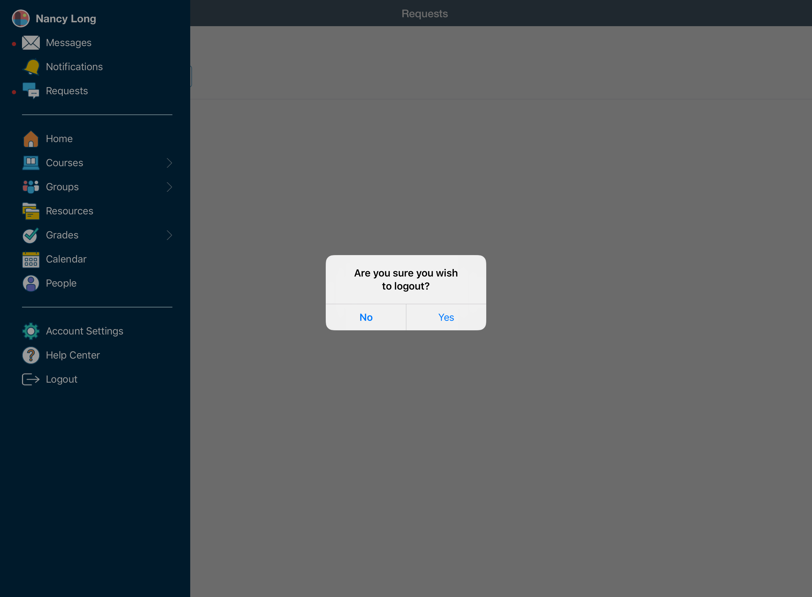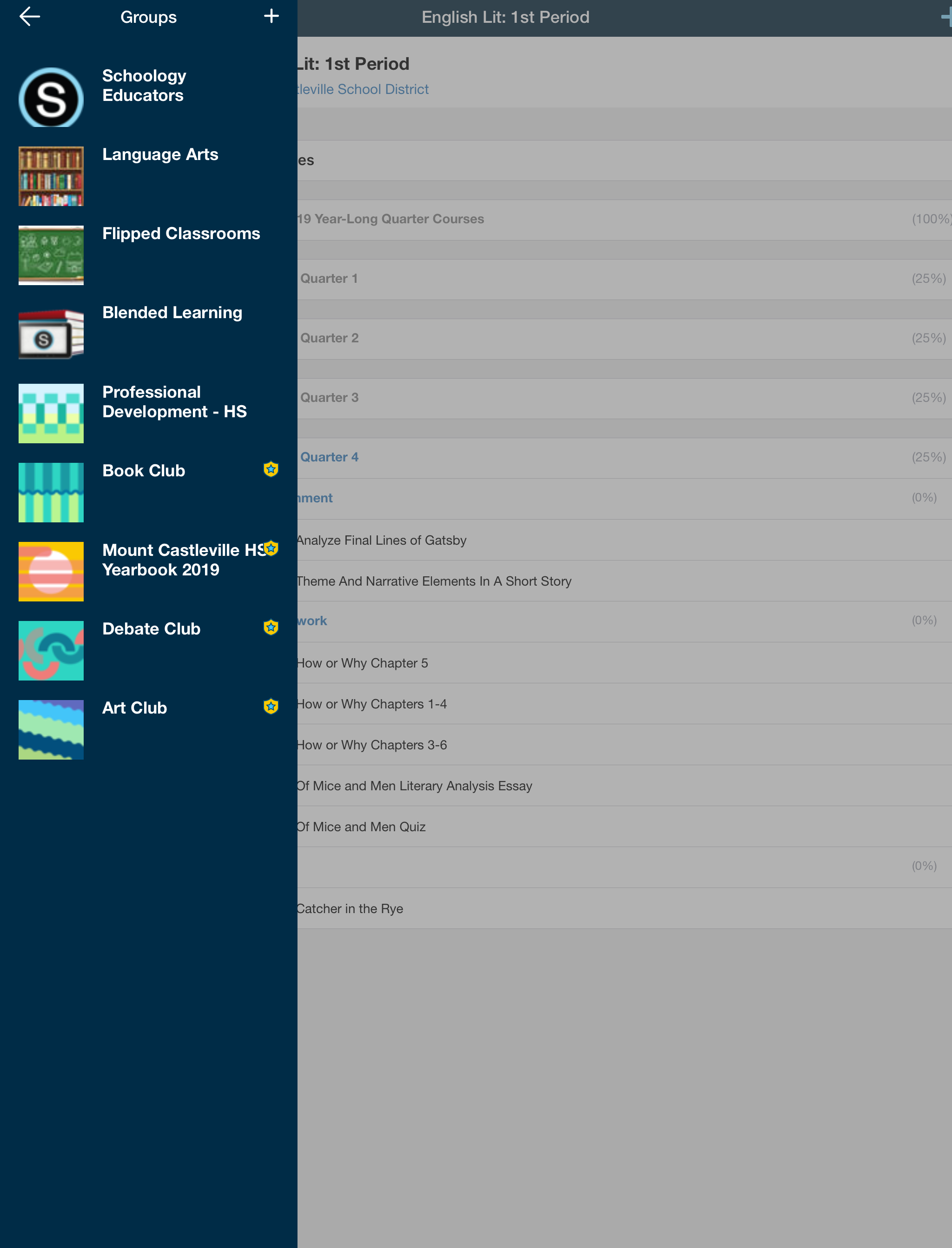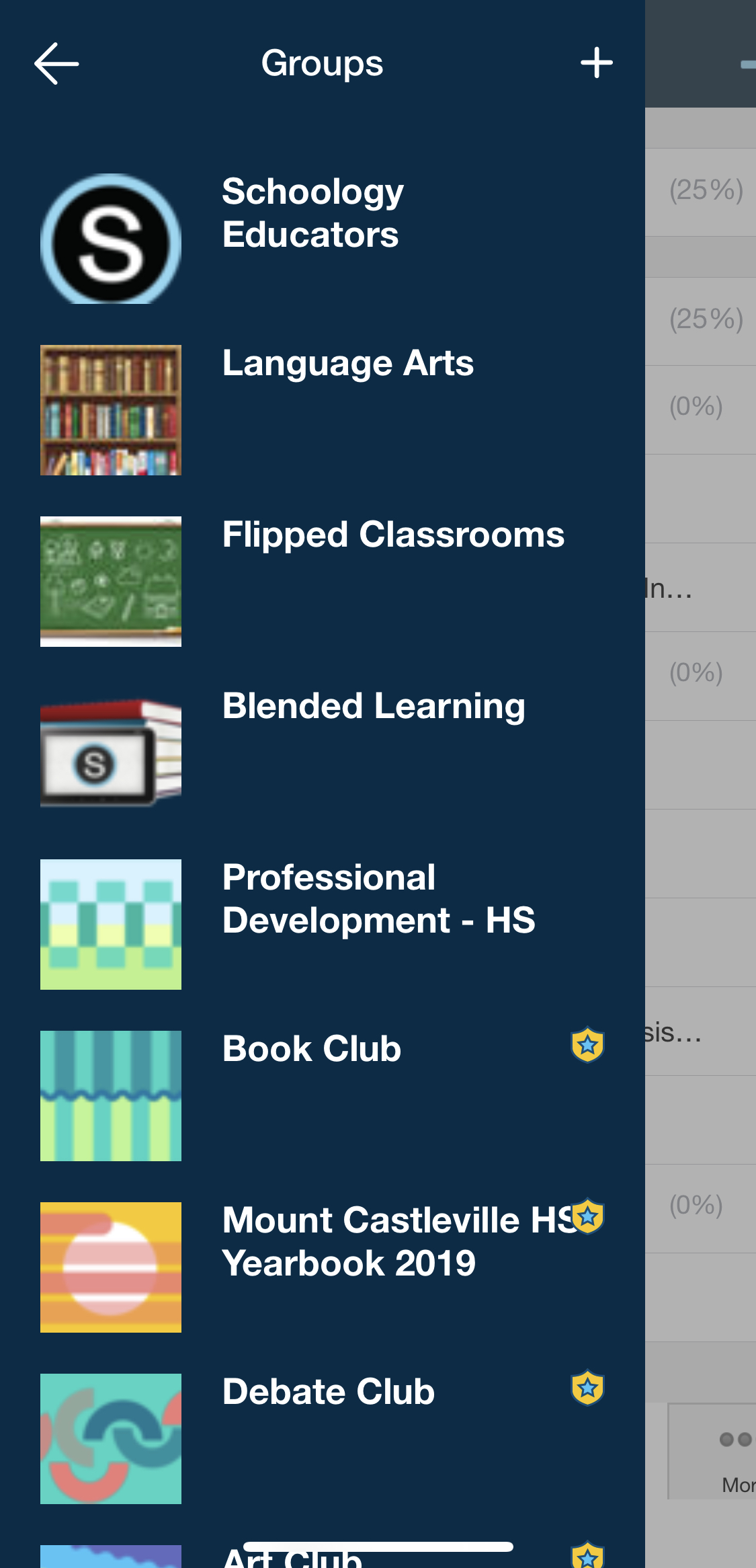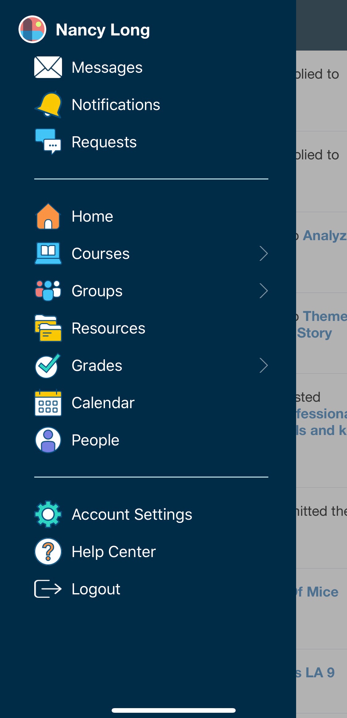 El menú de navegación de la aplicación de Schoology para iPhone le permite navegar rápidamente a todos los lugares más importantes de la aplicación de Schoology. Pulse el menú de navegación de la esquina superior izquierda de la pantalla para acceder a las siguientes áreas: