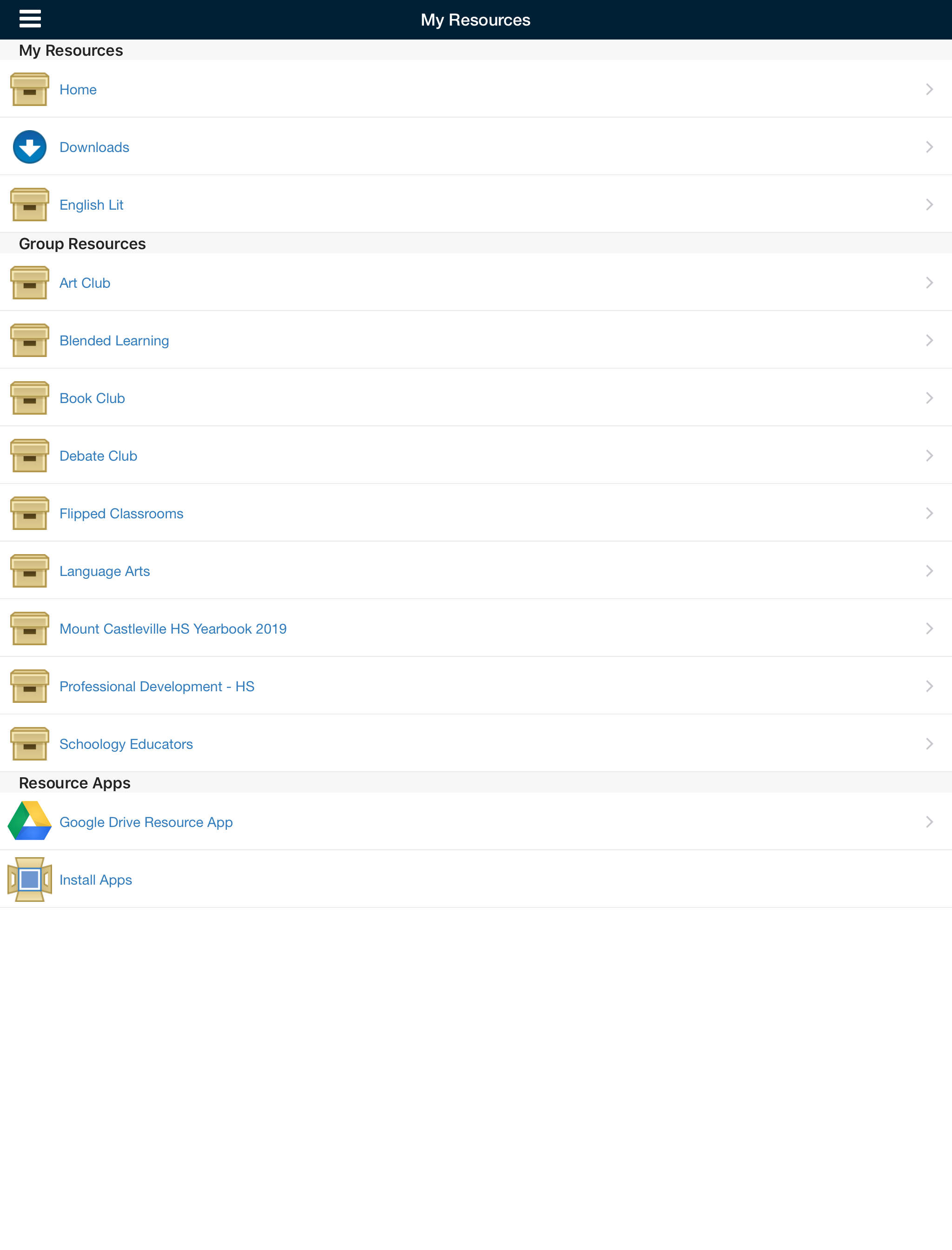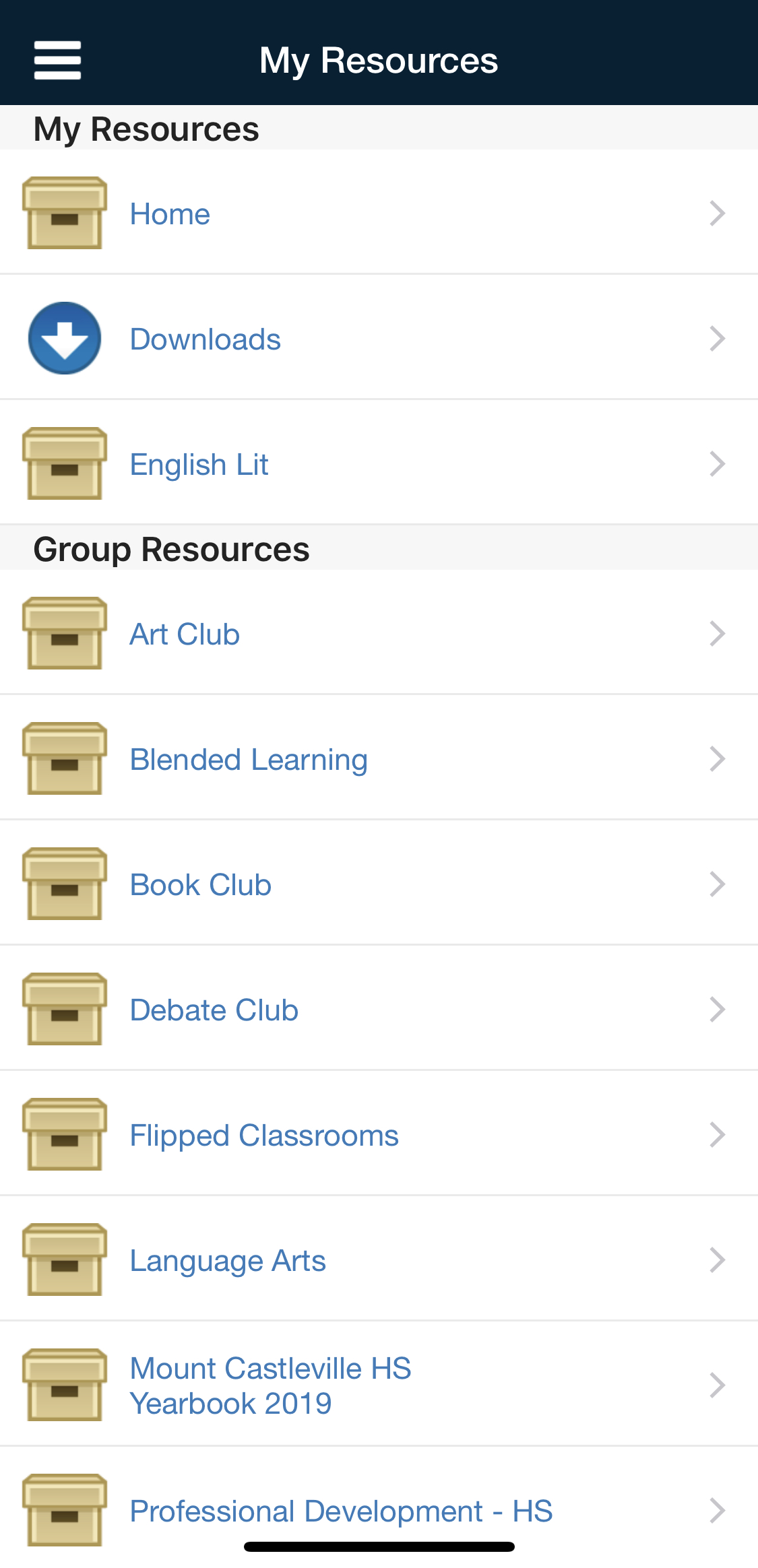 Según su dispositivo, puede acceder al área Recursos al pulsar Más en la barra de pestañas inferior del perfil del grupo y, luego, pulsar Recursos, o bien puede pulsar Recursos directamente en el menú de la izquierda. En Recursos del grupo, se muestran los materiales y los recursos asociados con el grupo.
