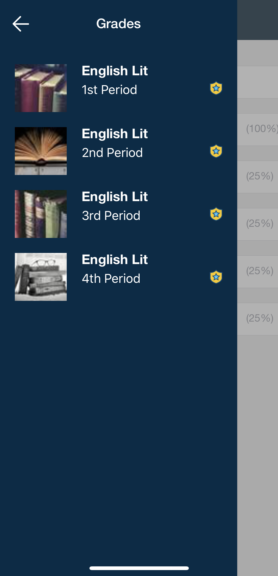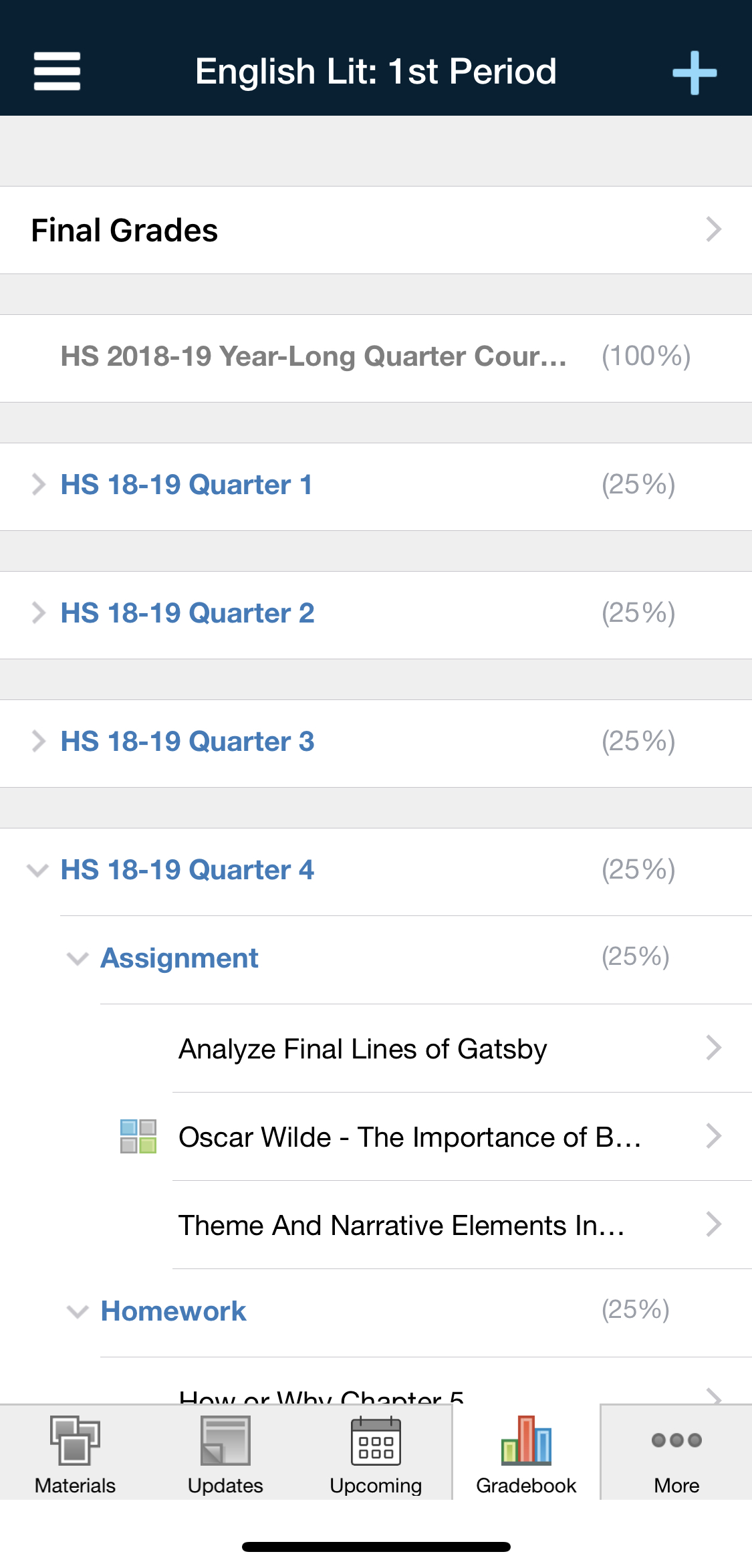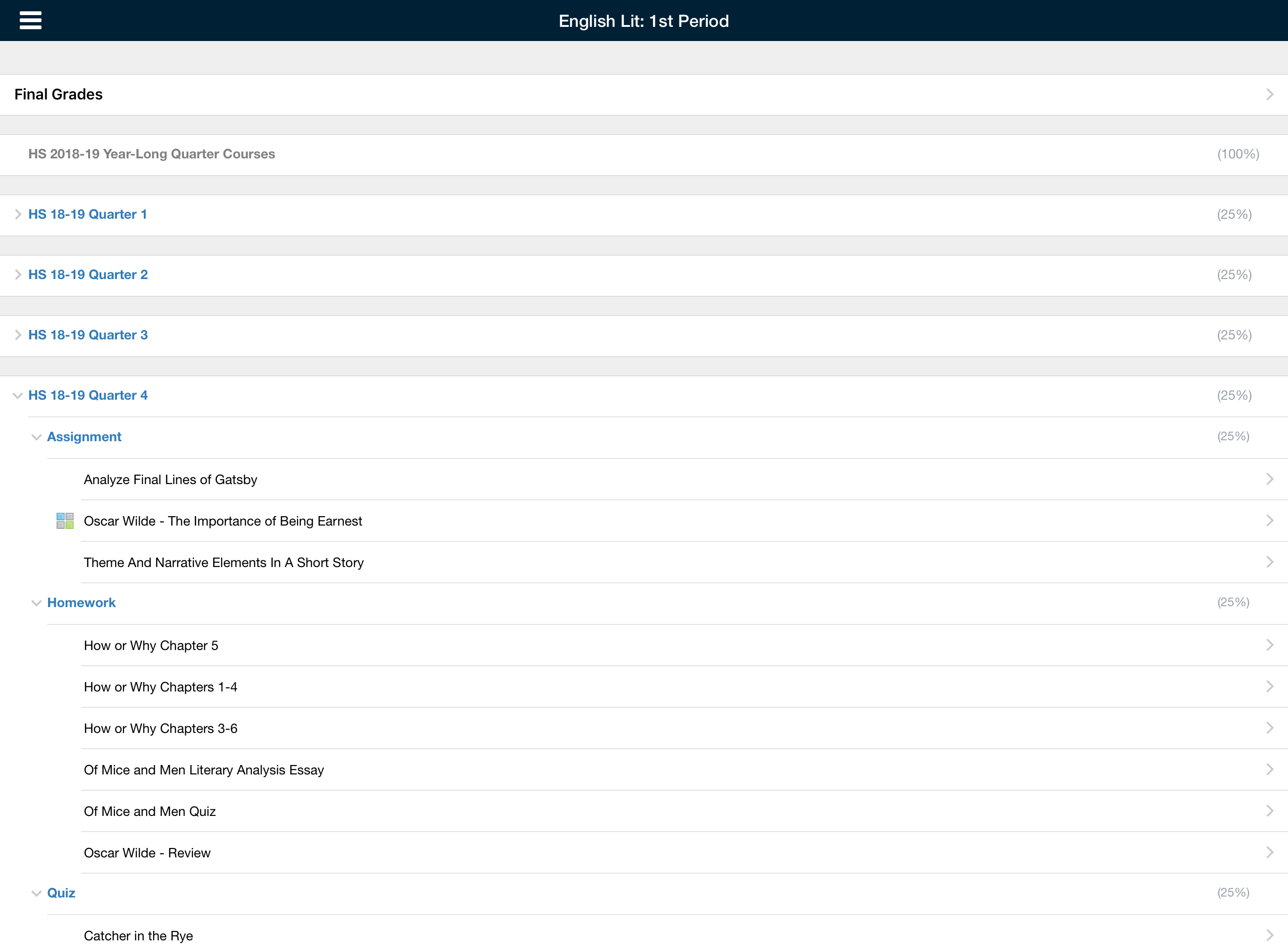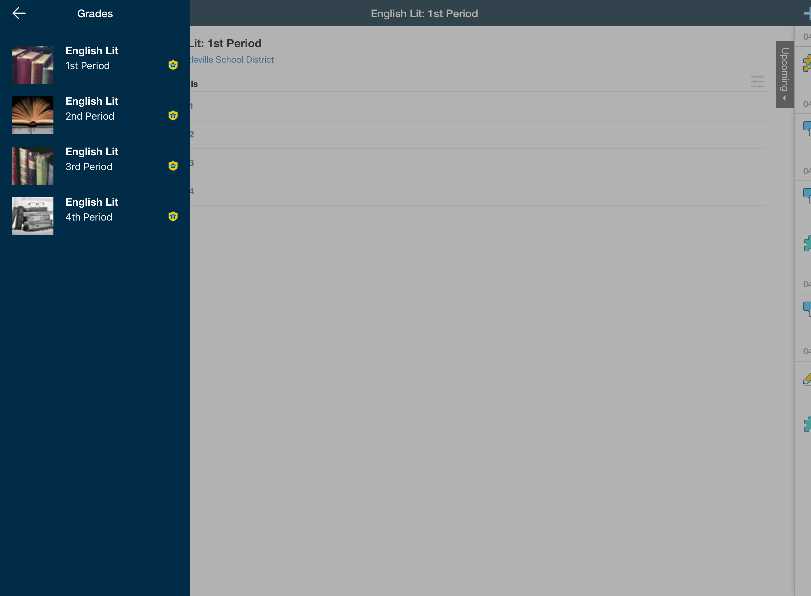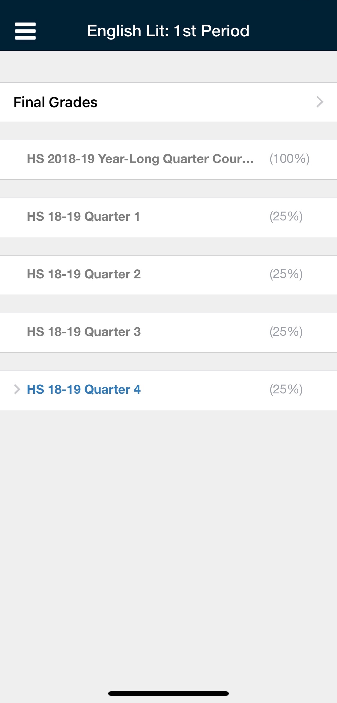 Para acceder a las calificaciones de la sección de un curso, pulse la sección que desee. Luego de pulsar la sección del curso, elija Calificaciones finales o el período de evaluación que desea ver.