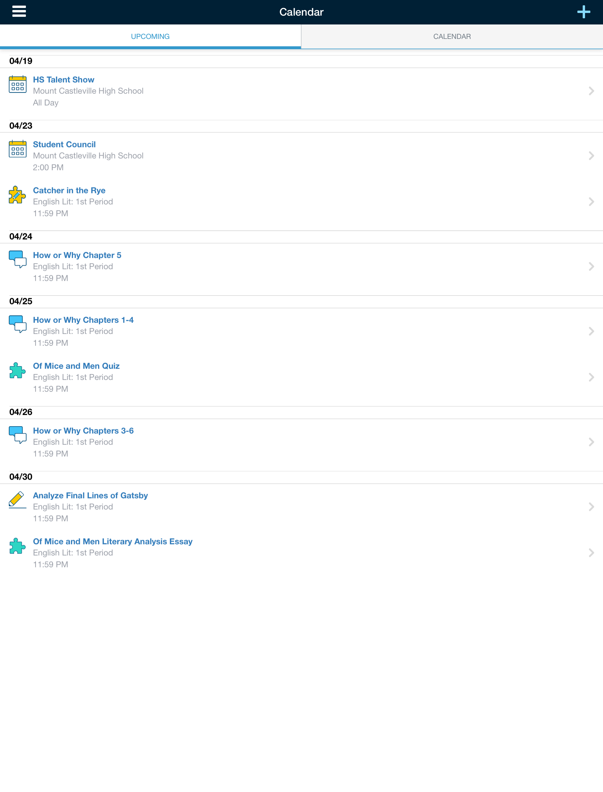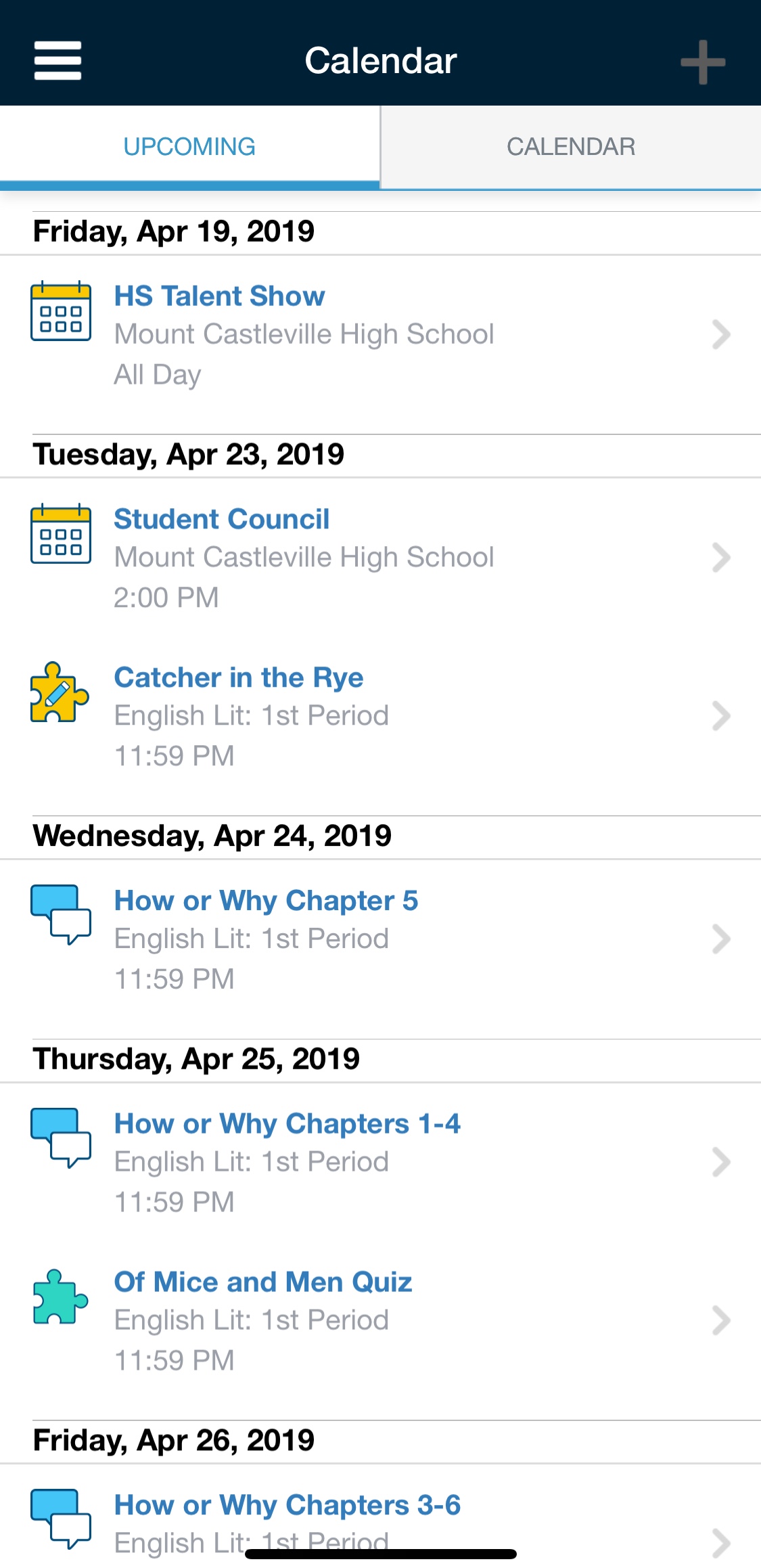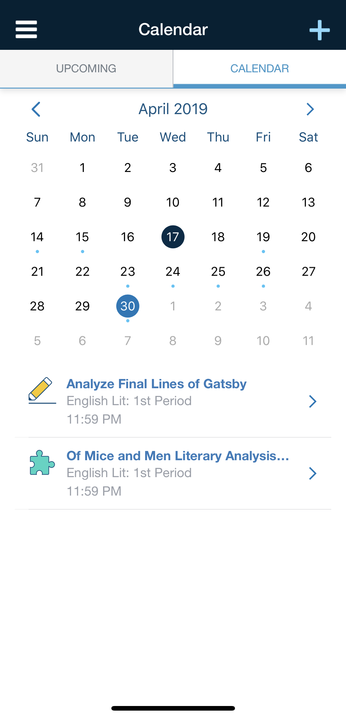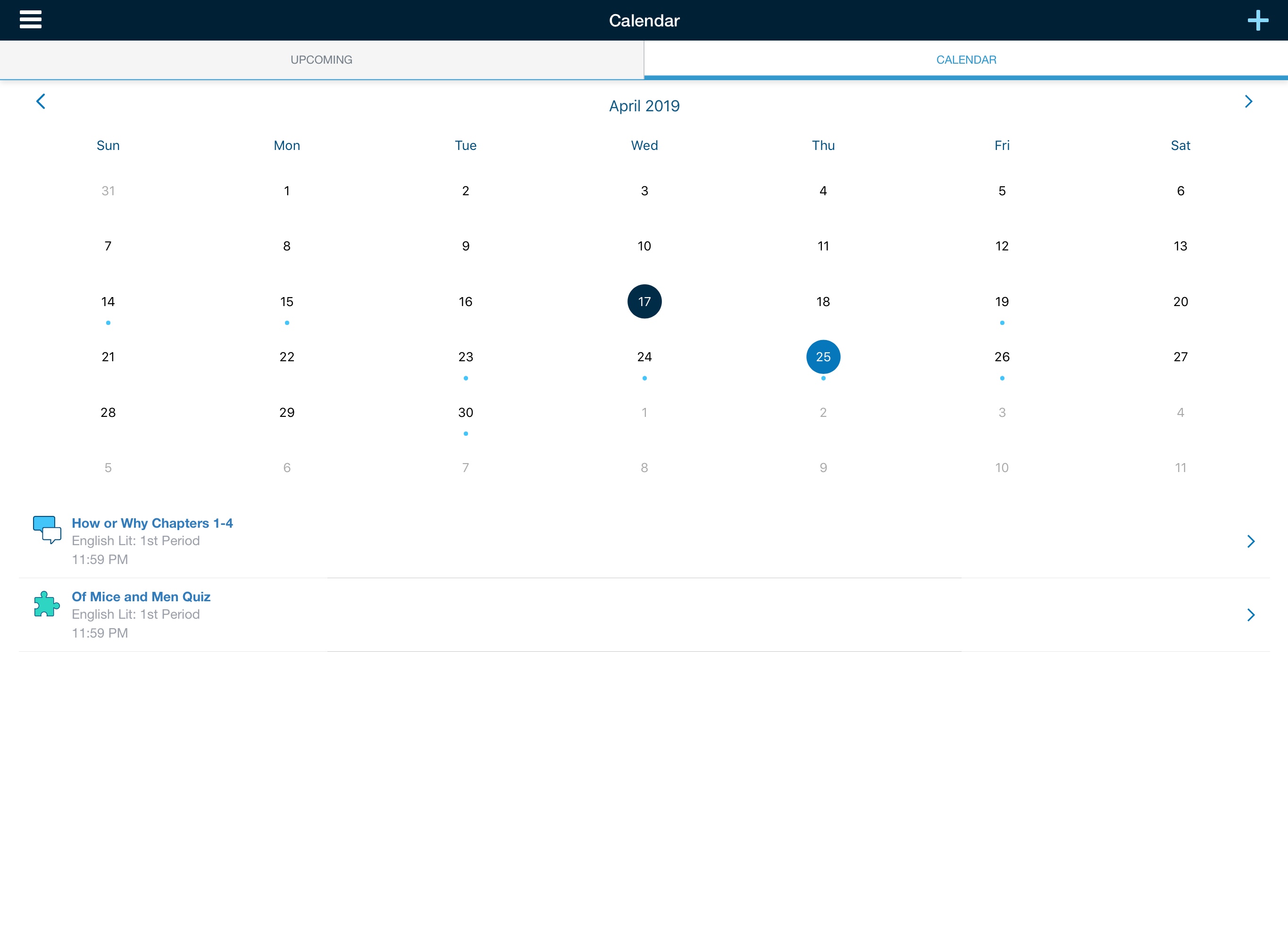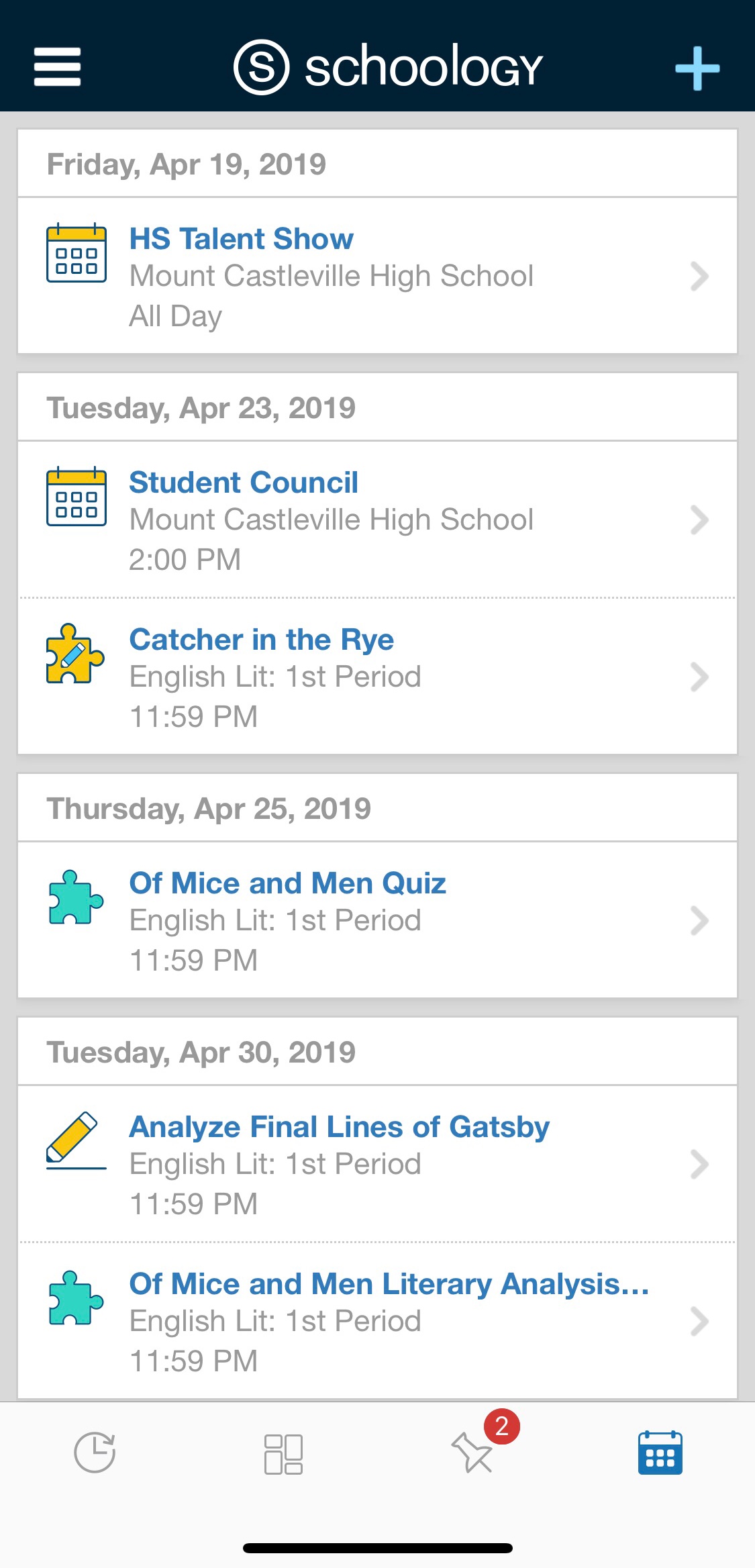 Esta área muestra todos los eventos, pruebas/cuestionarios, evaluaciones, tareas y foros asociados con su perfil de Schoology en una lista de eventos Próximos por día y en una vista tradicional de Calendario por mes.