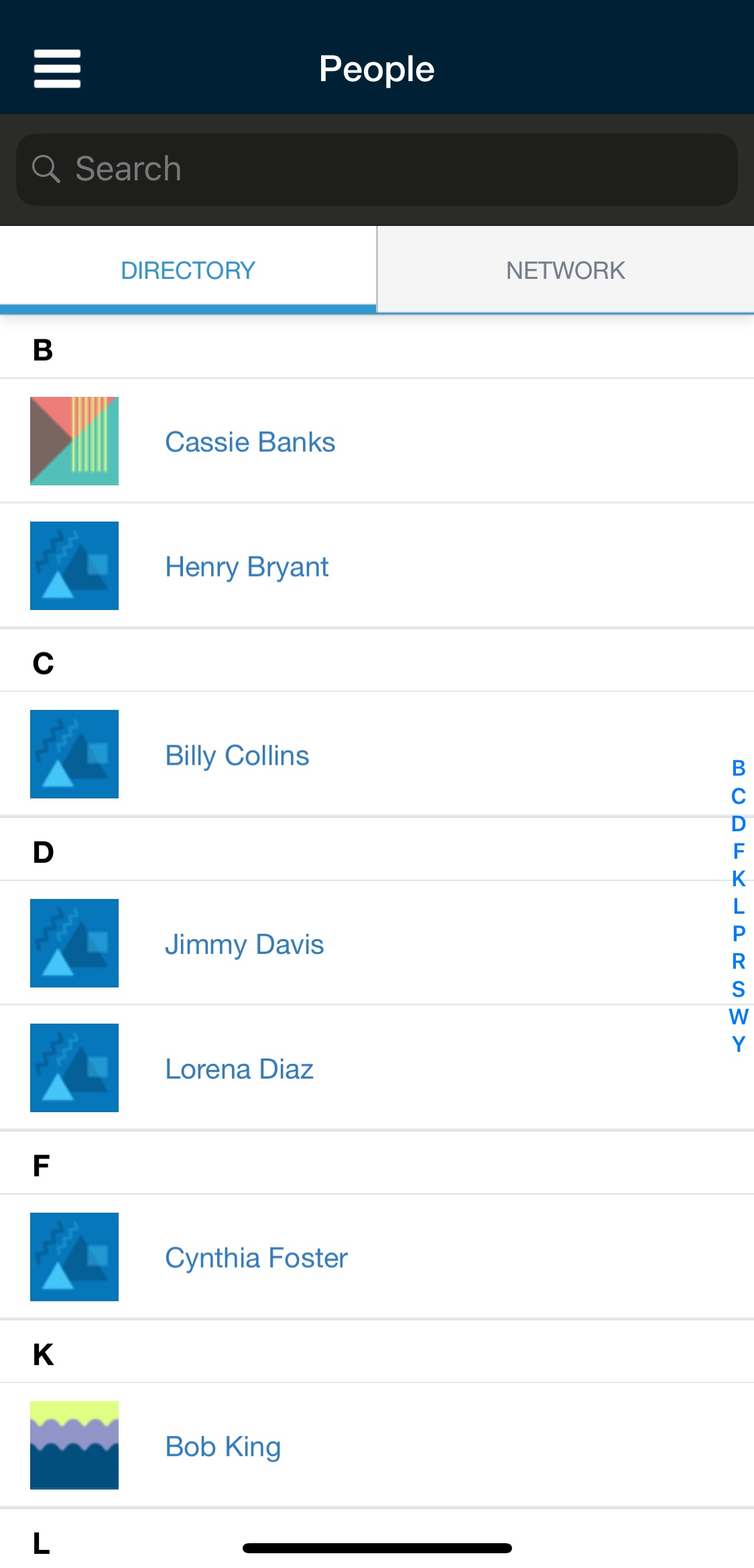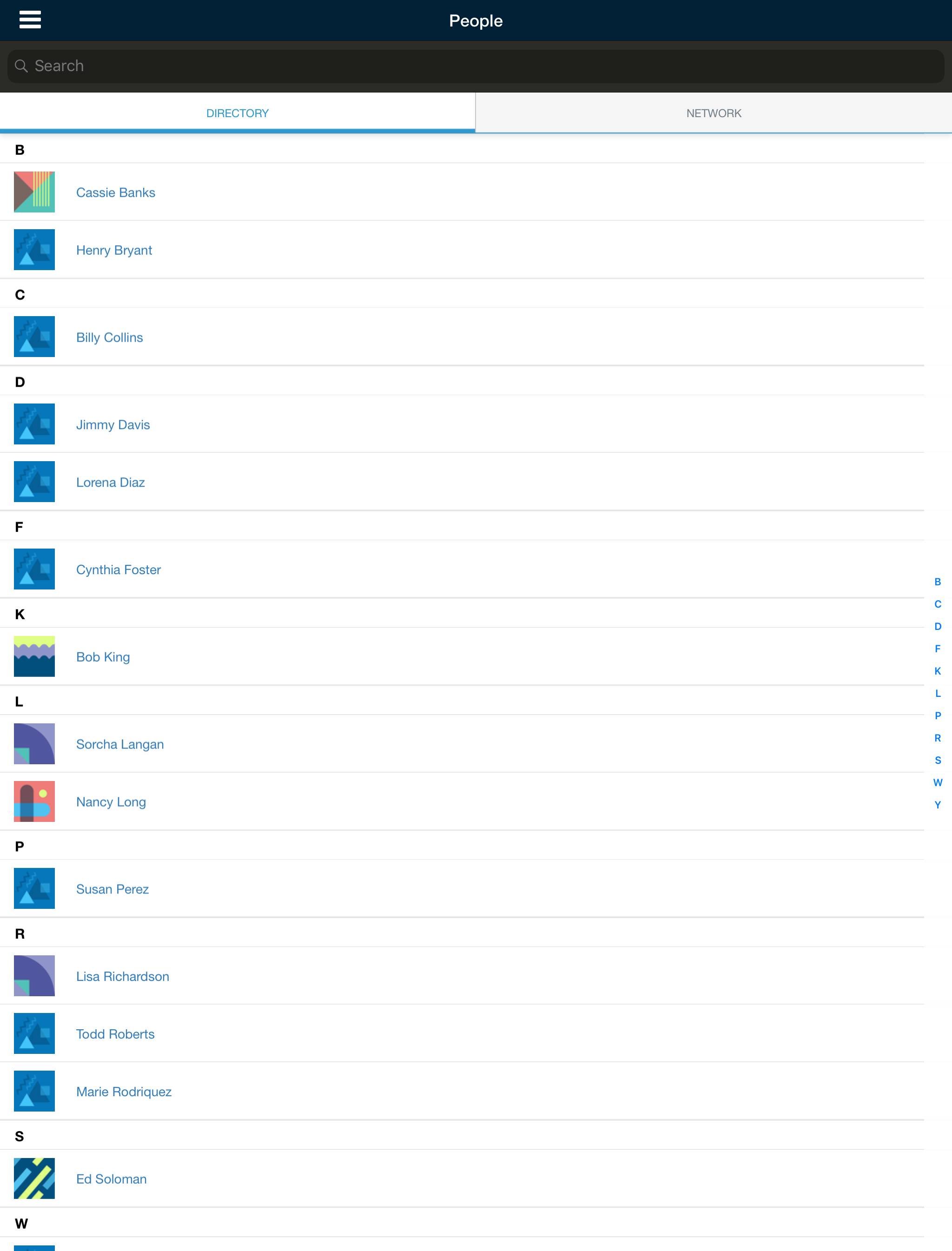 El área Personas le permite ver el directorio del centro educativo y la red. Pulse Directorio para ver una lista de todos los miembros del centro educativo en orden alfabético por apellido. Para ver el perfil de un miembro, simplemente pulse el nombre del usuario. Pulse Red para ver todos los miembros de su red en orden alfabético por apellido.