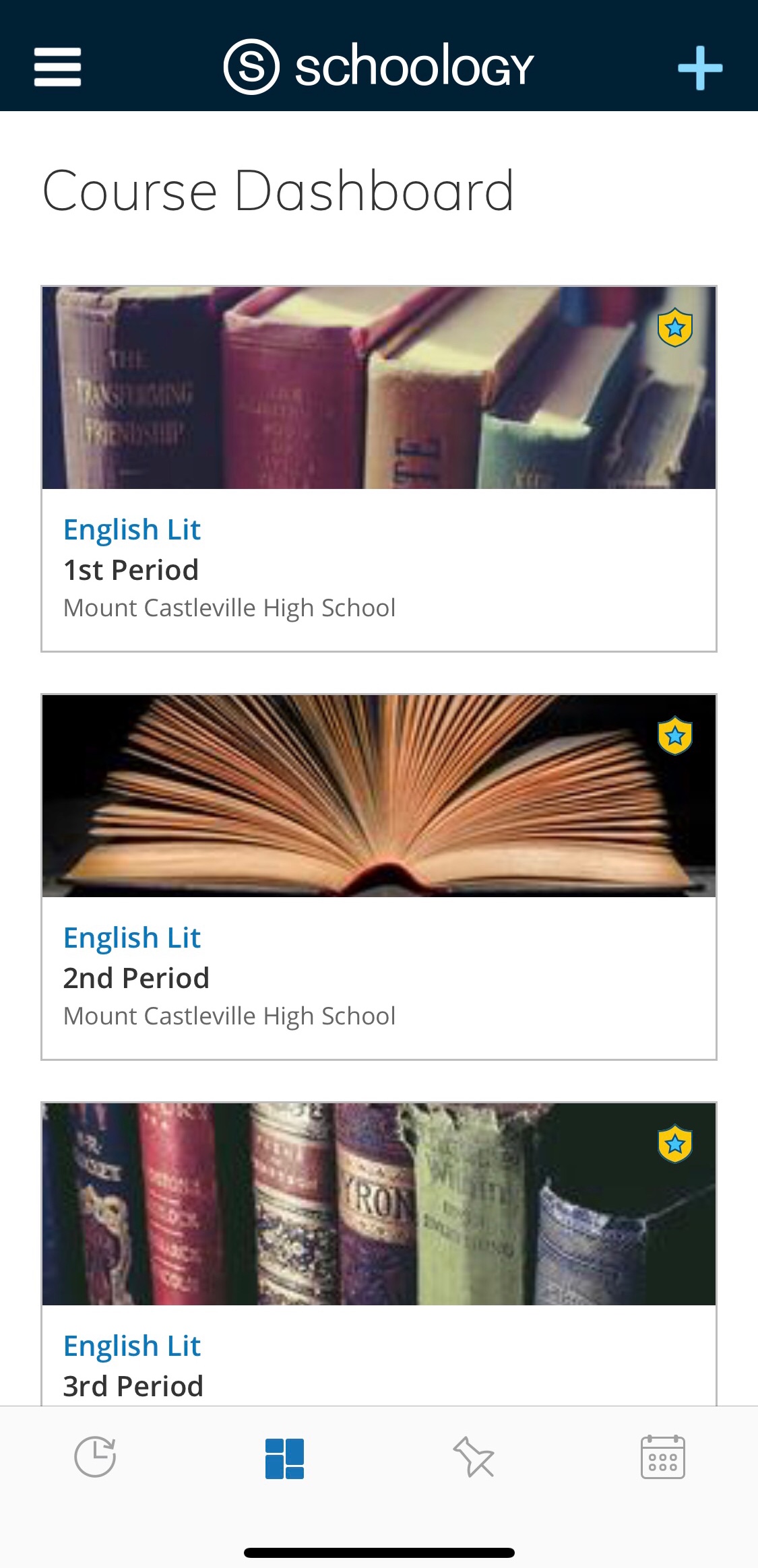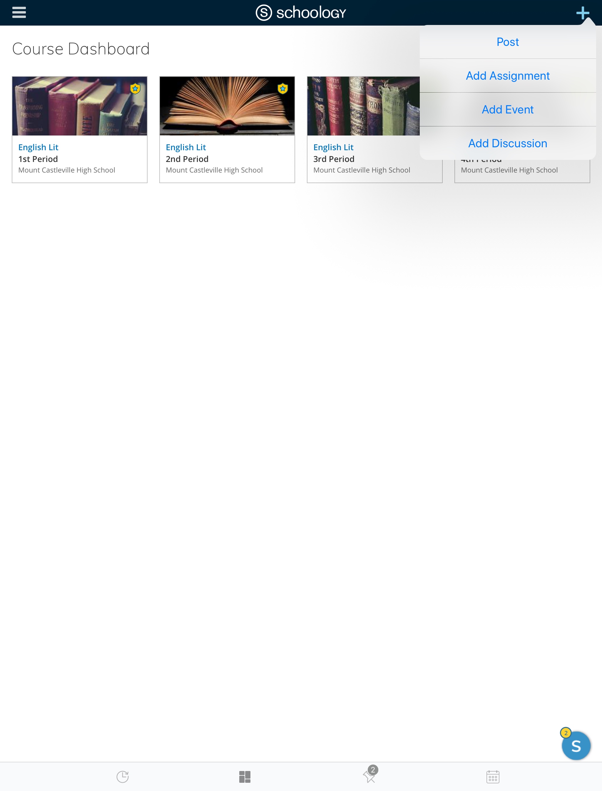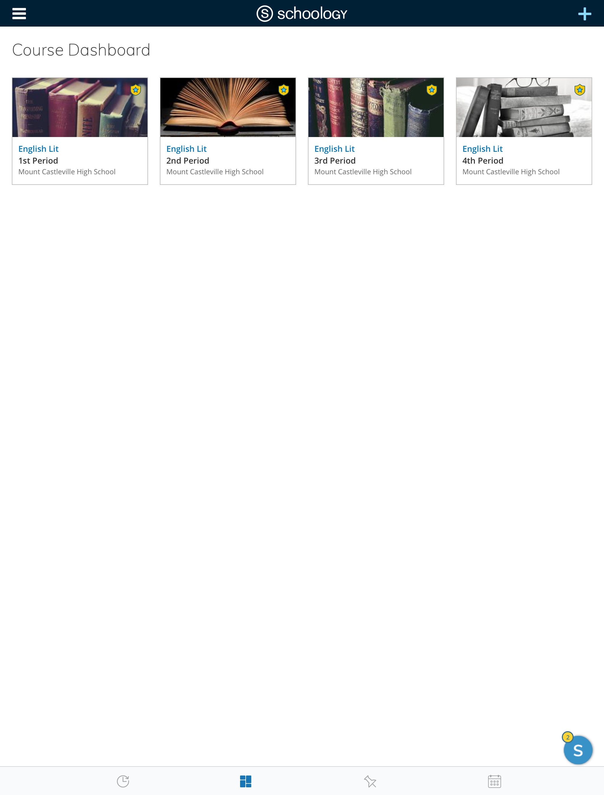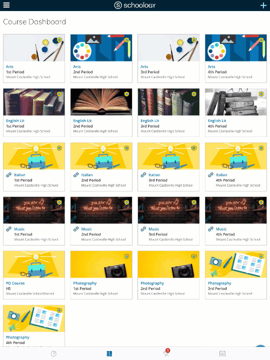 Según la configuración de la cuenta, verá el área Actividad reciente o el panel del curso de manera predeterminada apenas abra la aplicación iOS de Schoology. El área Actividad reciente muestra todas las actualizaciones más recientes y las publicaciones de blog que aparecen en la página de inicio de Schoology. El panel del curso muestra los cursos en formato de lista en mosaico.
