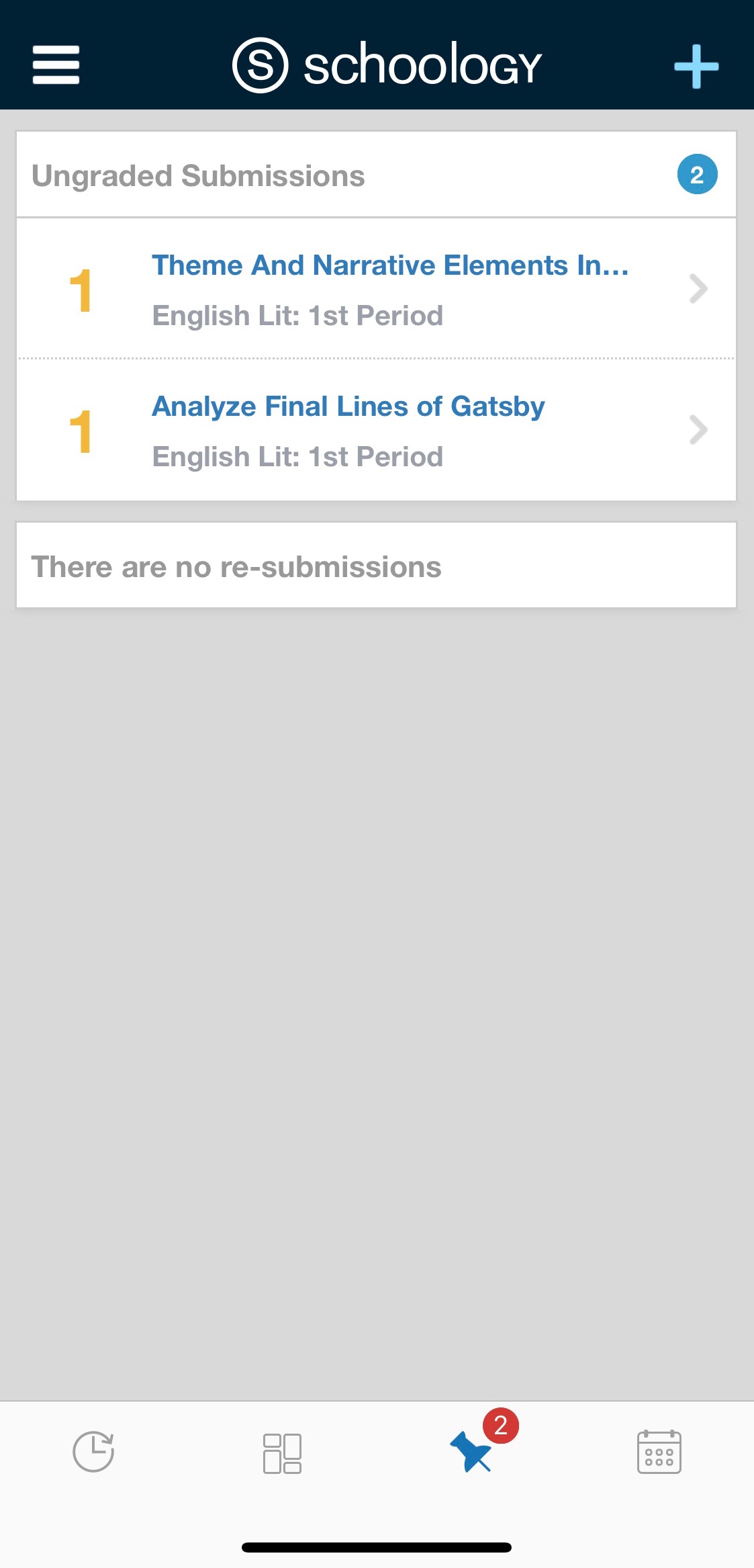 En la pantalla de inicio, los instructores pueden pulsar el icono de chincheta para acceder a los recordatorios. En esta área, se muestran las entregas sin calificar y las nuevas entregas que deben revisarse.