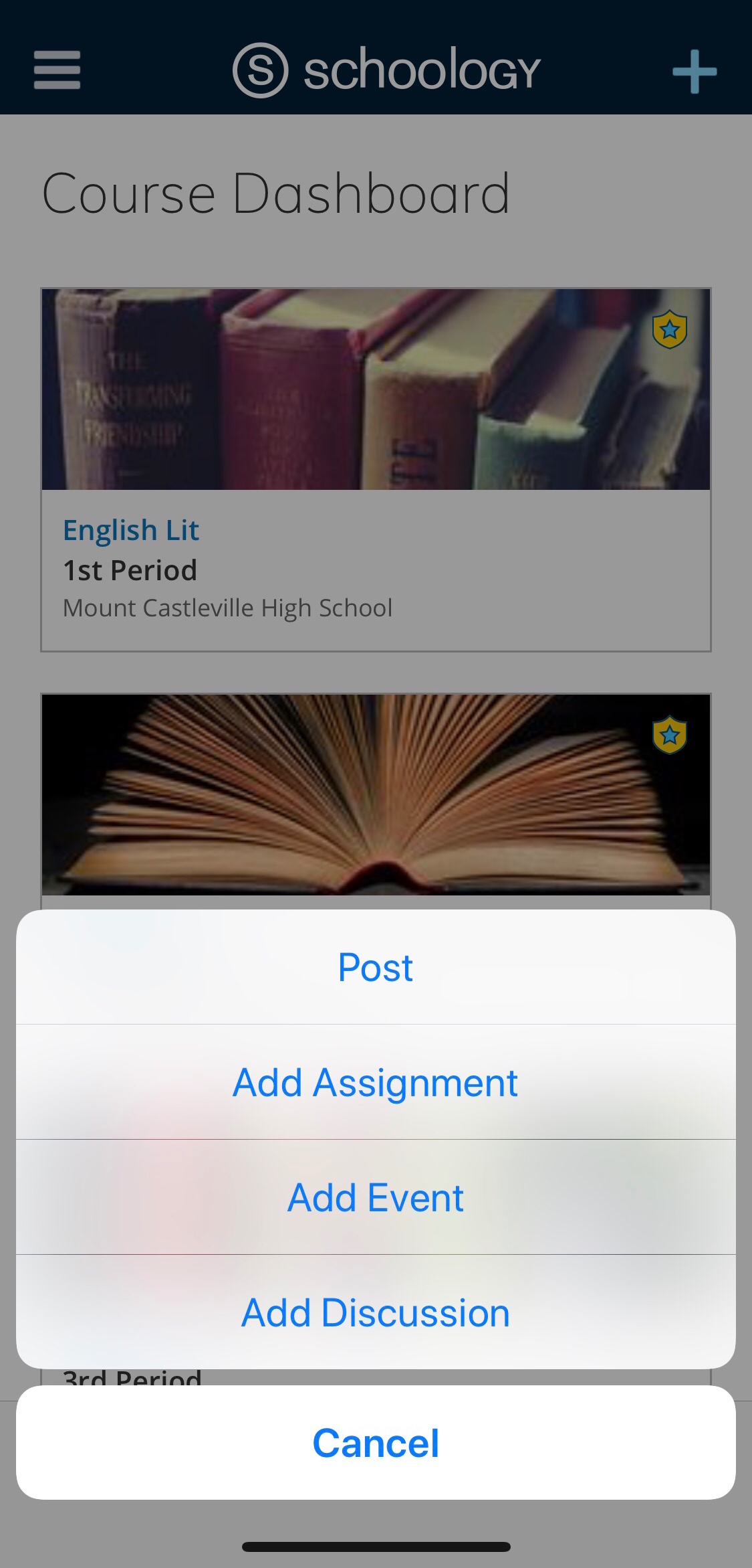 La publicación rápida en la aplicación iOS de Schoology le permite crear rápidamente actualizaciones, tareas, eventos y foros tanto desde la pantalla de inicio de Schoology como desde los cursos y grupos. Pulse el icono + en la esquina superior derecha de la pantalla para ver estas opciones: