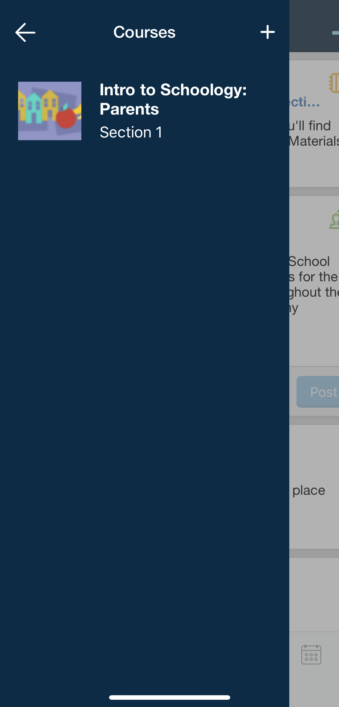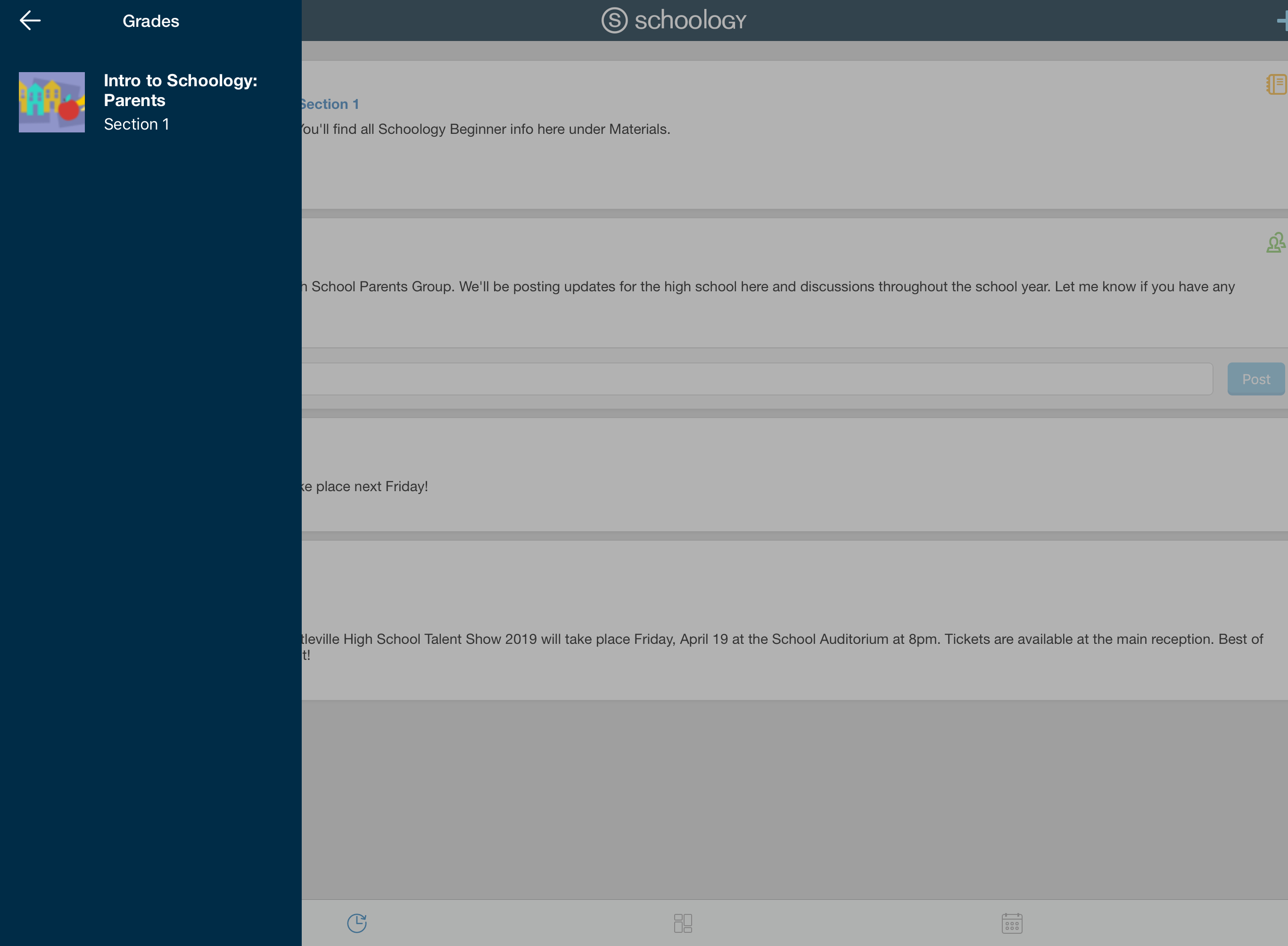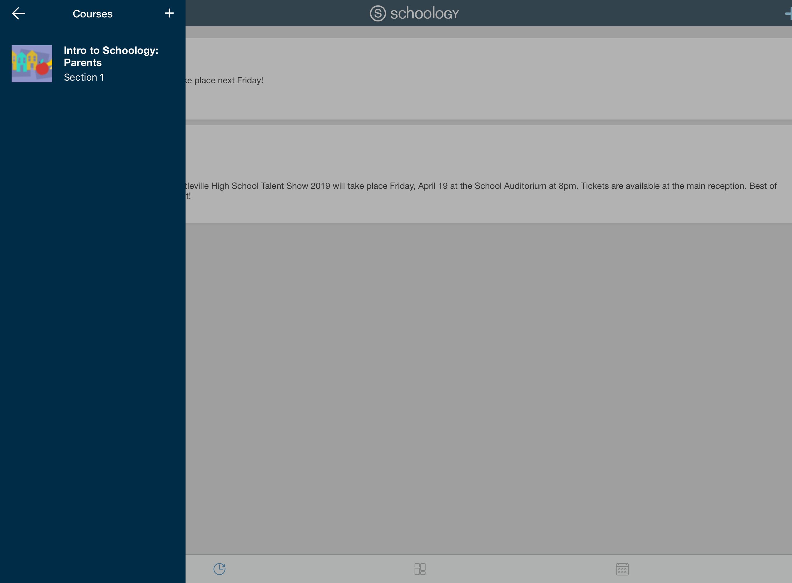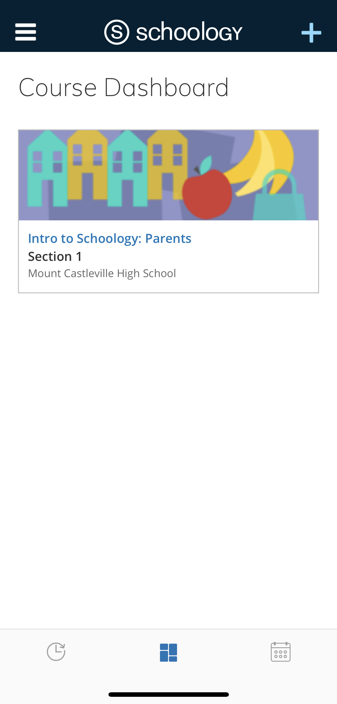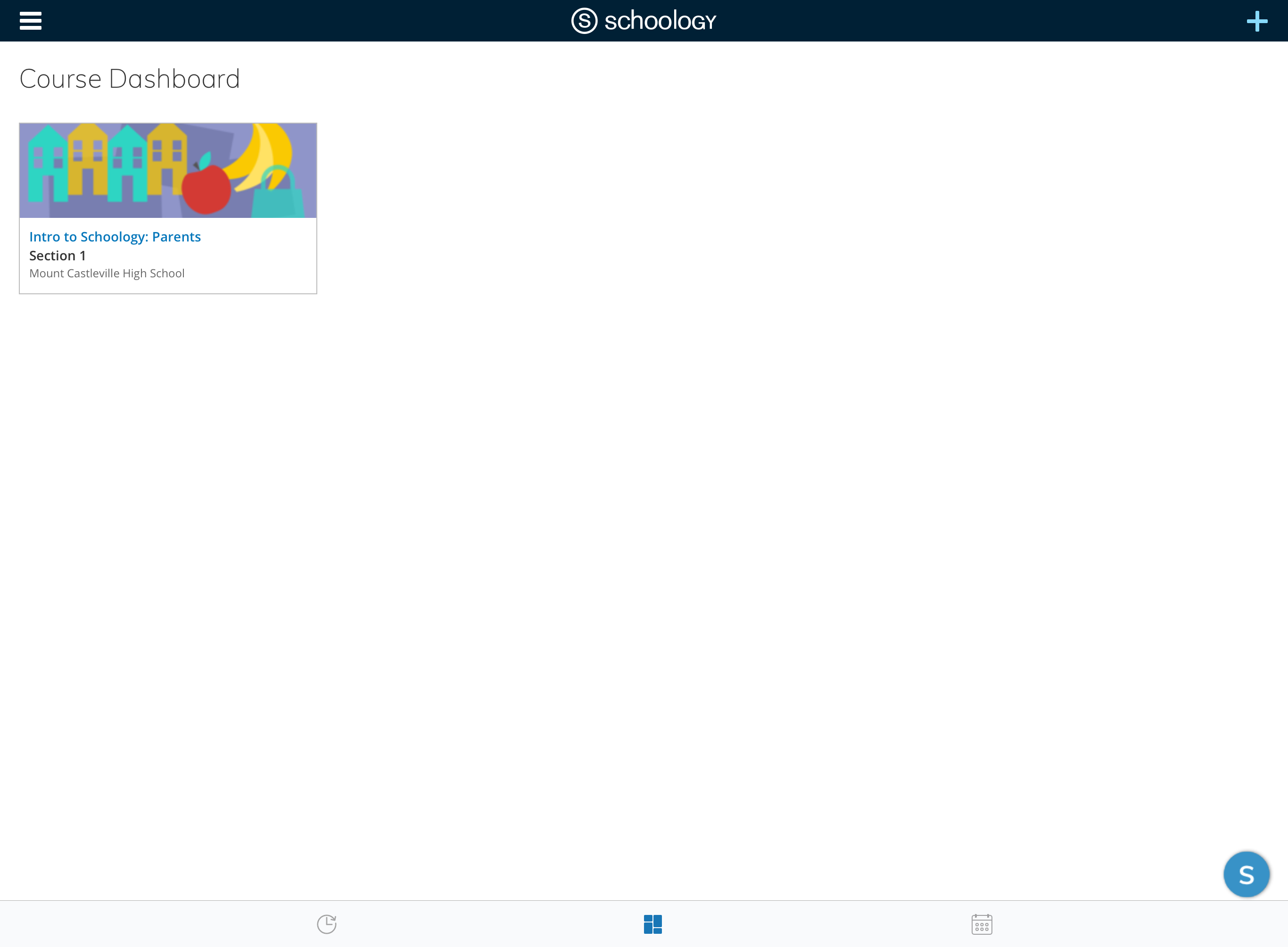 Según la configuración de la cuenta, verá el área Actividad reciente o el panel del curso de manera predeterminada apenas abra la aplicación para iOS de Schoology. El área Actividad reciente muestra todas las actualizaciones y las publicaciones de blog más recientes que aparecen en la página de inicio de Schoology. El panel del curso muestra los cursos en formato de lista en mosaico.