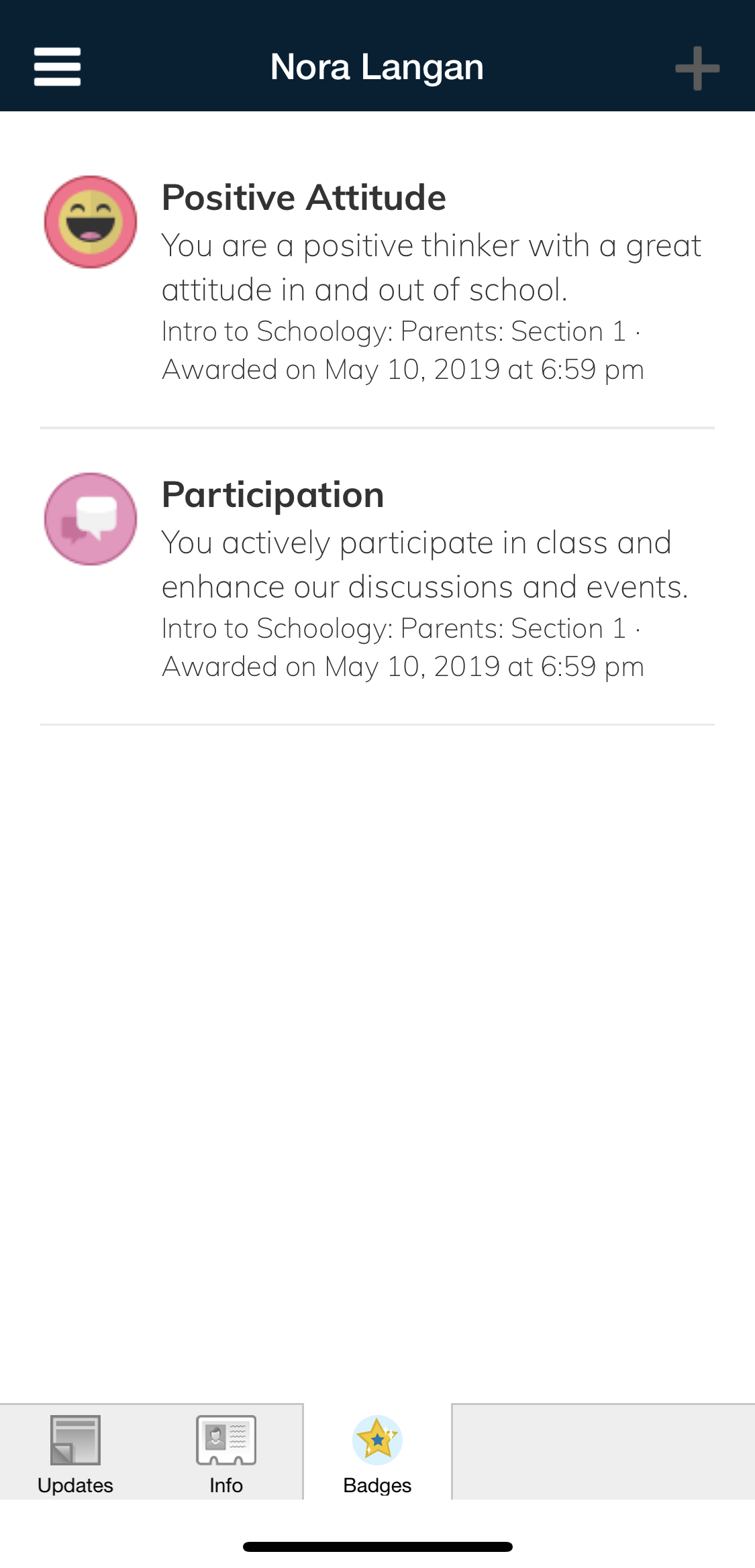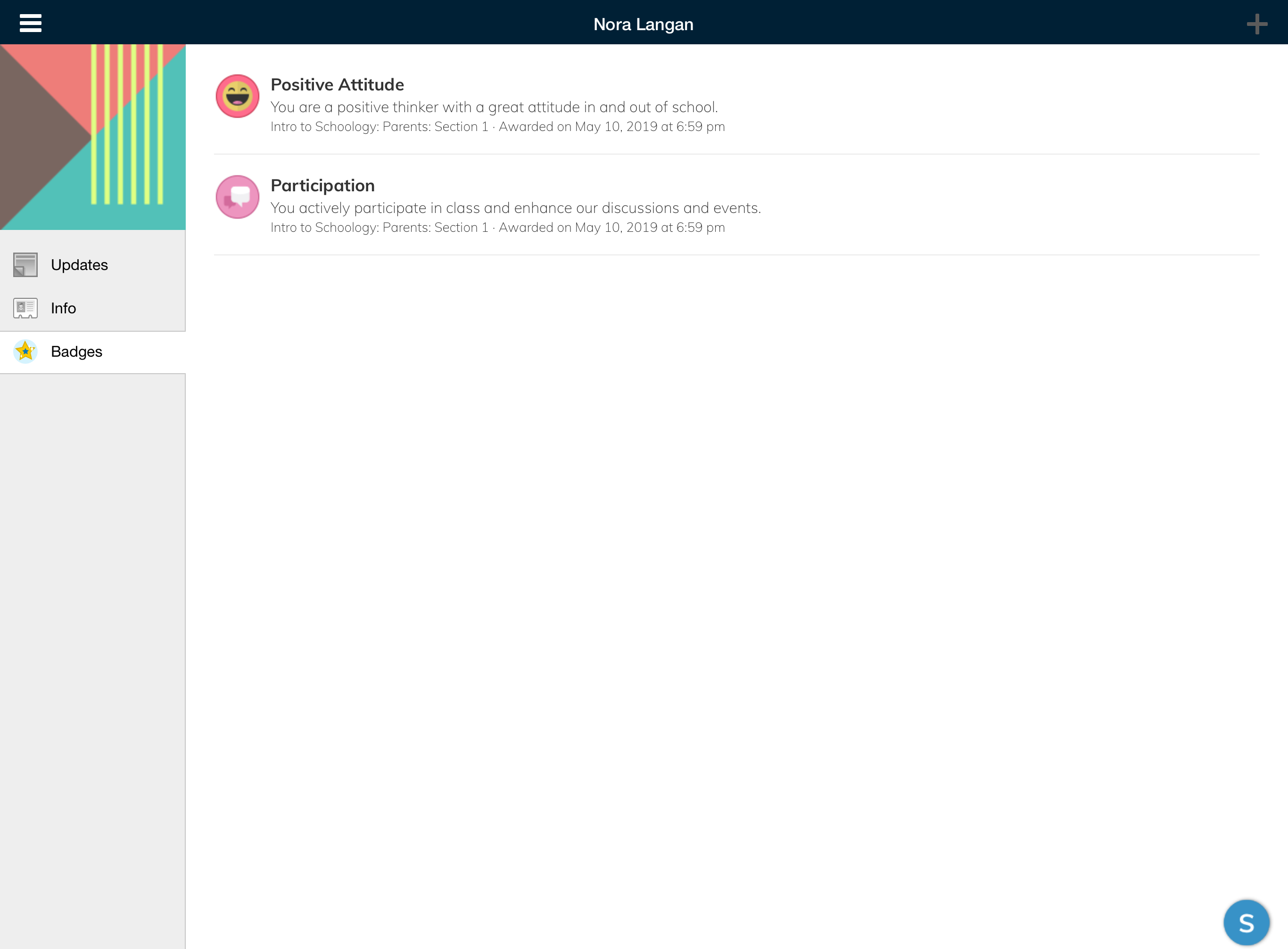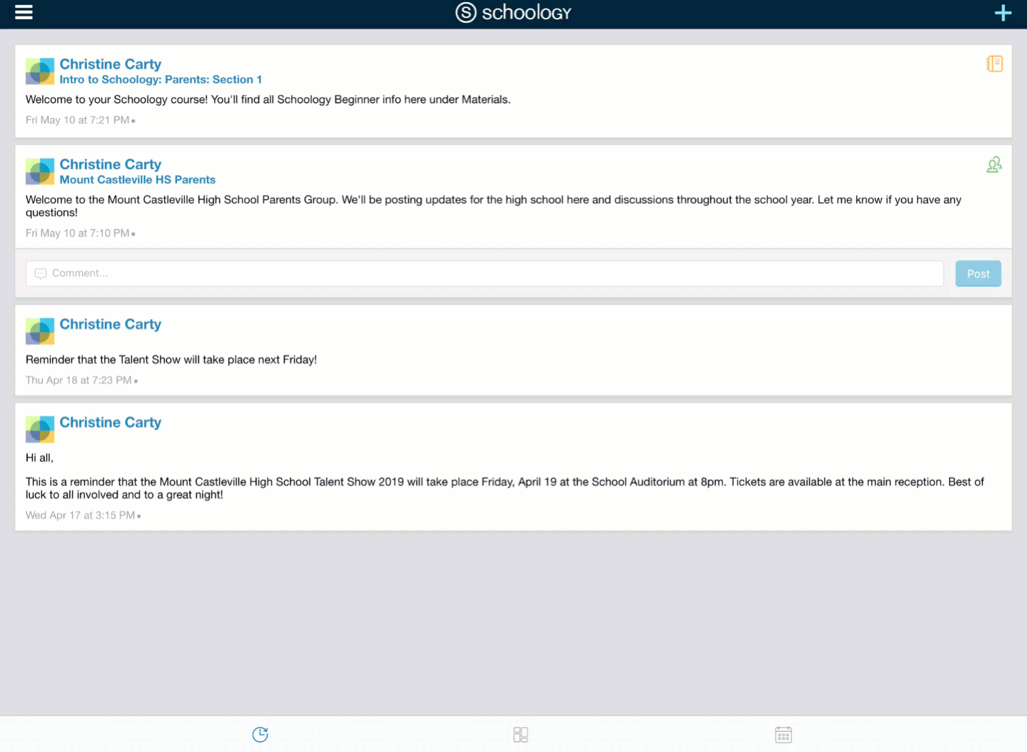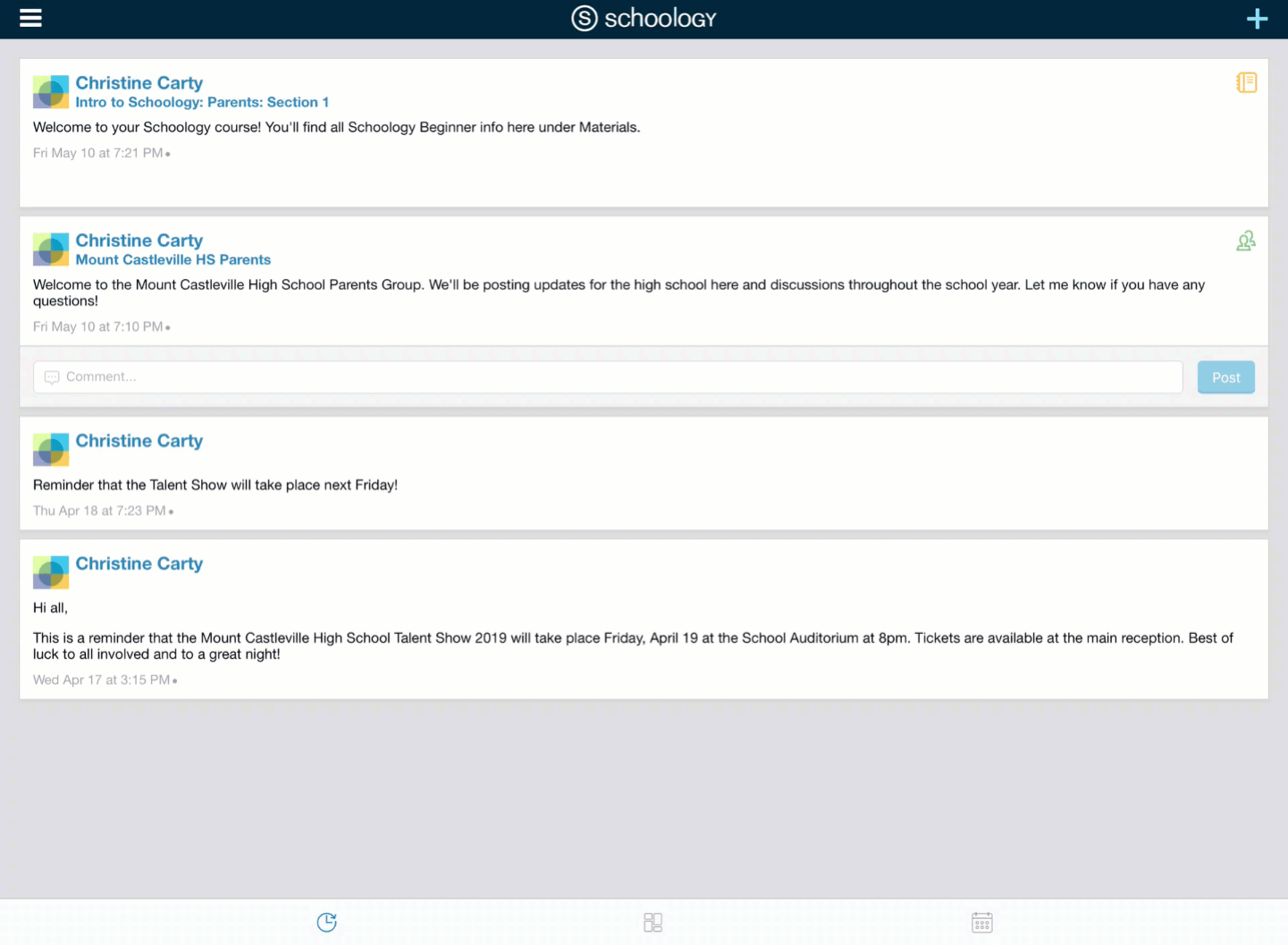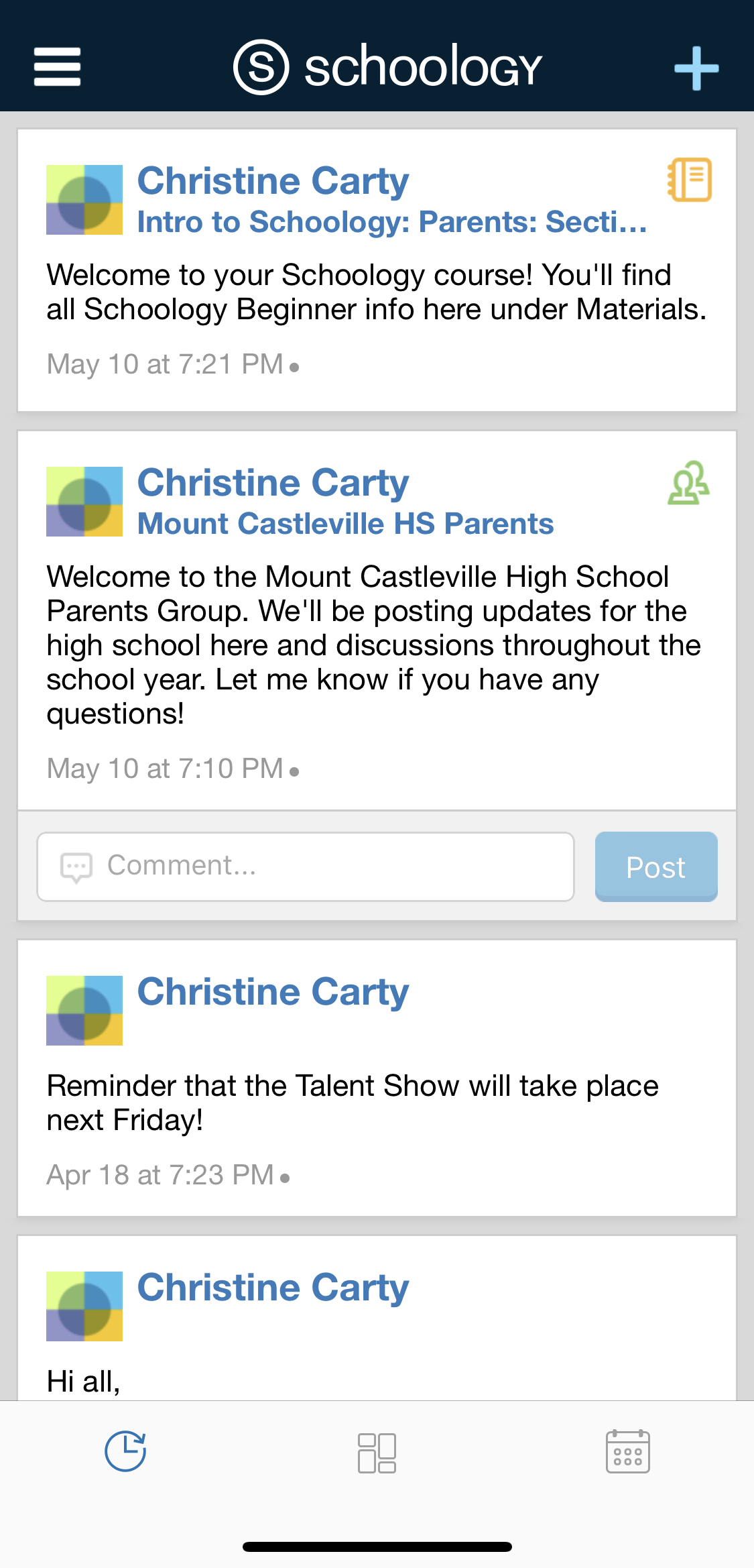 Según la configuración de la cuenta, verá el área Actividad reciente o el panel del curso de manera predeterminada apenas abra la aplicación para iOS de Schoology. El área Actividad reciente muestra todas las actualizaciones y las publicaciones de blog más recientes que aparecen en la página de inicio de Schoology. El panel del curso muestra los cursos en formato de lista en mosaico.