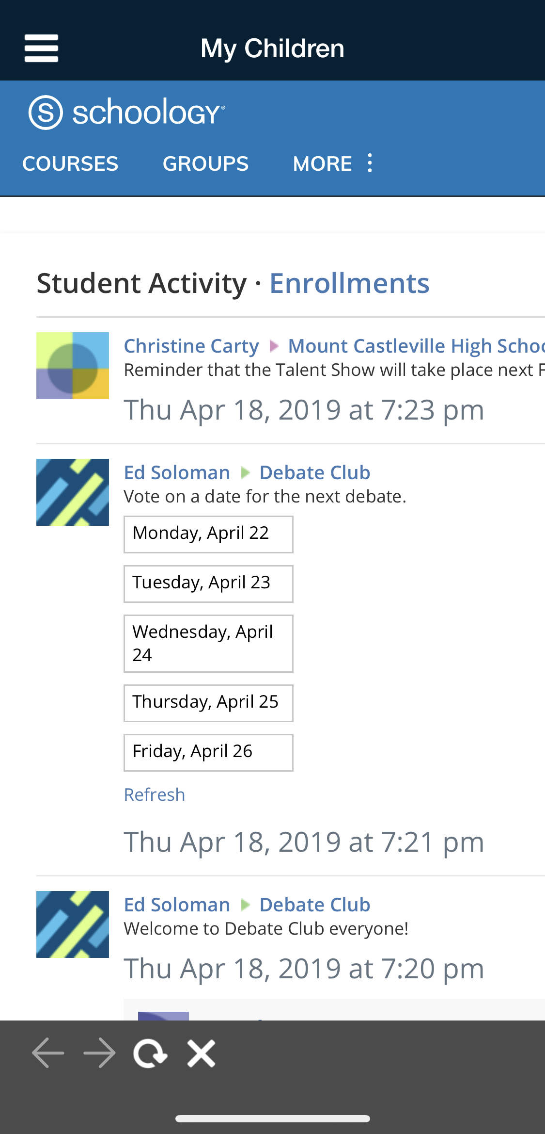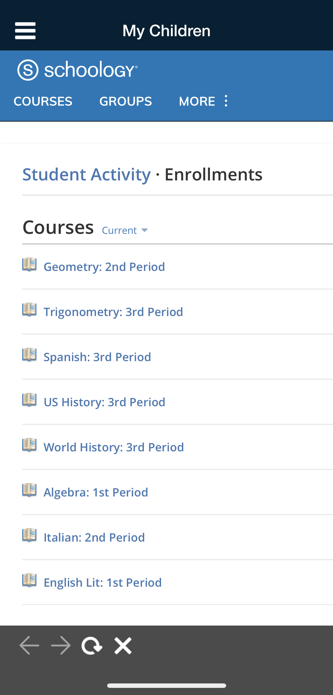 Nota: Estos son grupos en los que se inscribió directamente con su cuenta de padres personal. Para ver los cursos de su hijo, diríjase a Mis hijos.