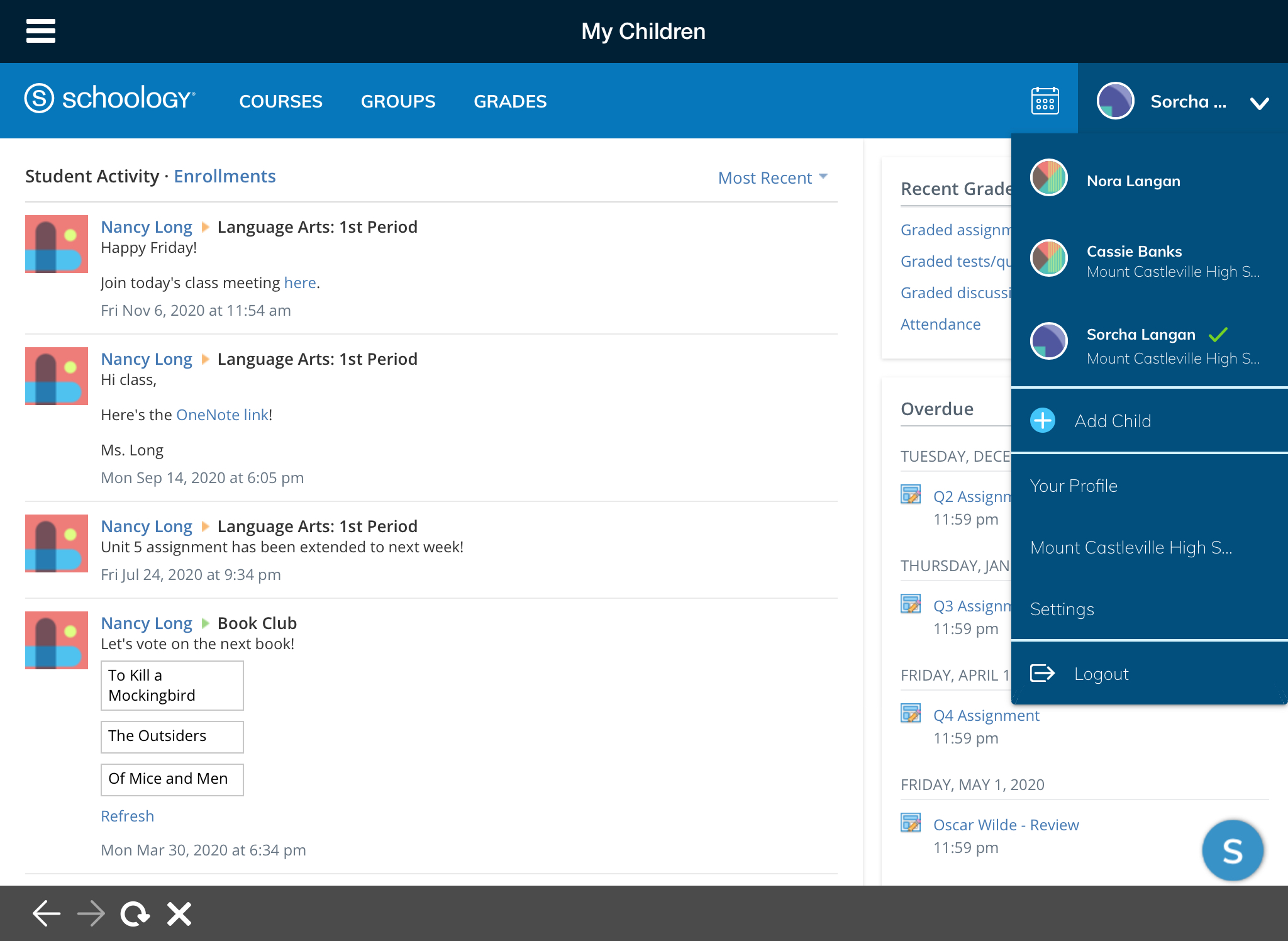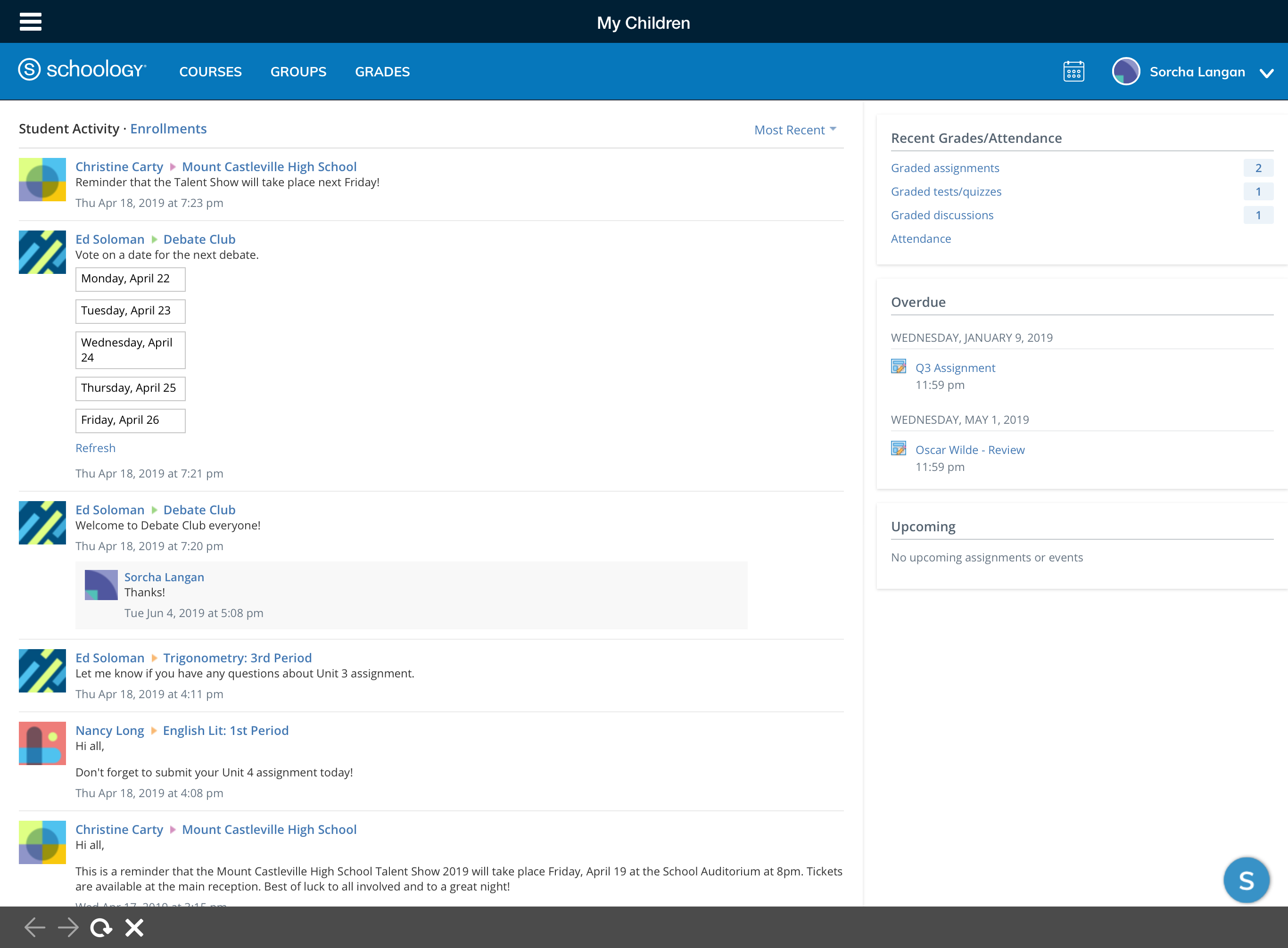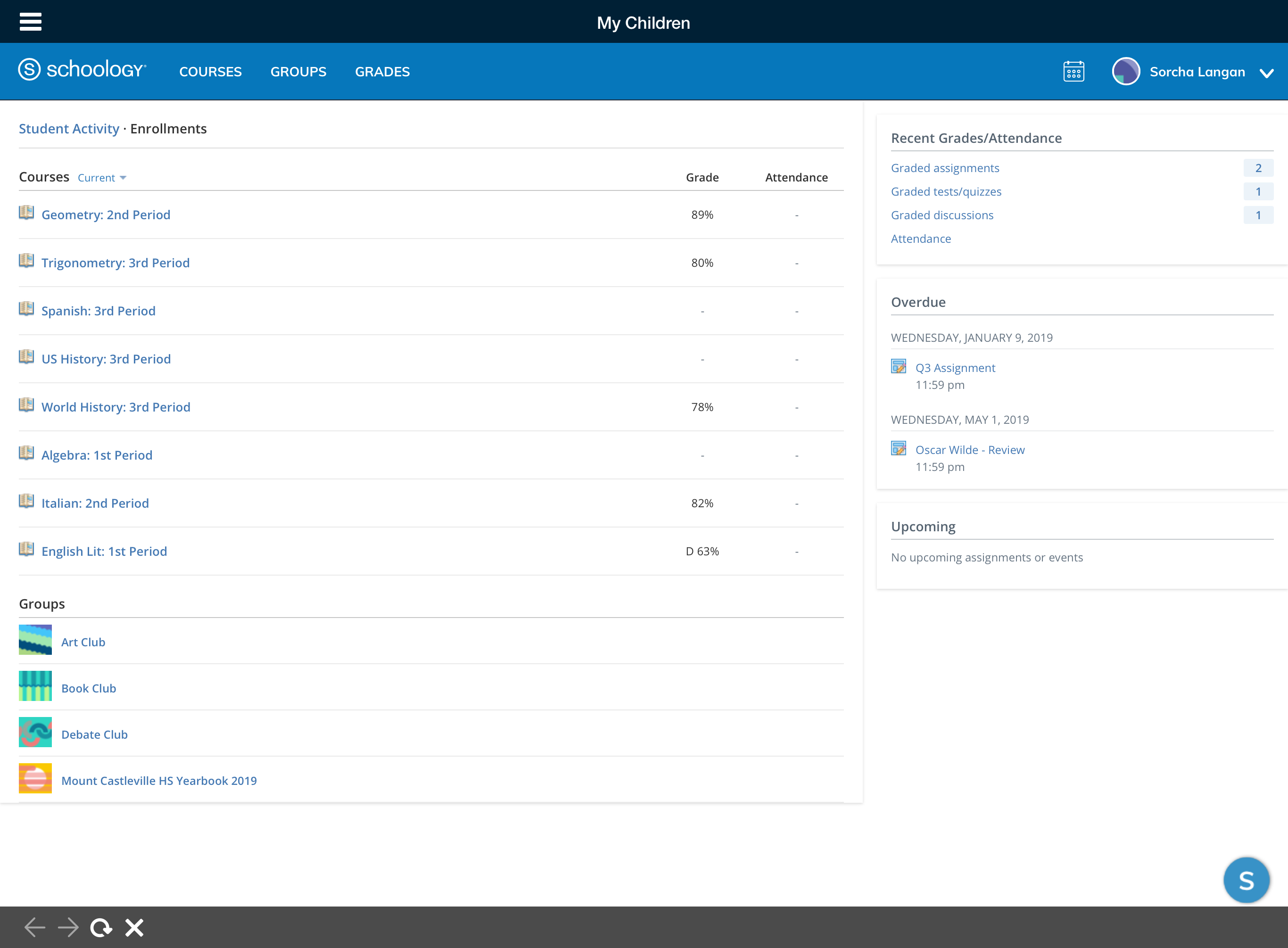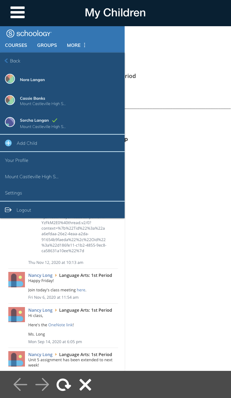 Mis hijos: consulte la actividad de sus hijos en Schoology (cursos, grupos, calendarios, calificaciones, asistencia, etc.).