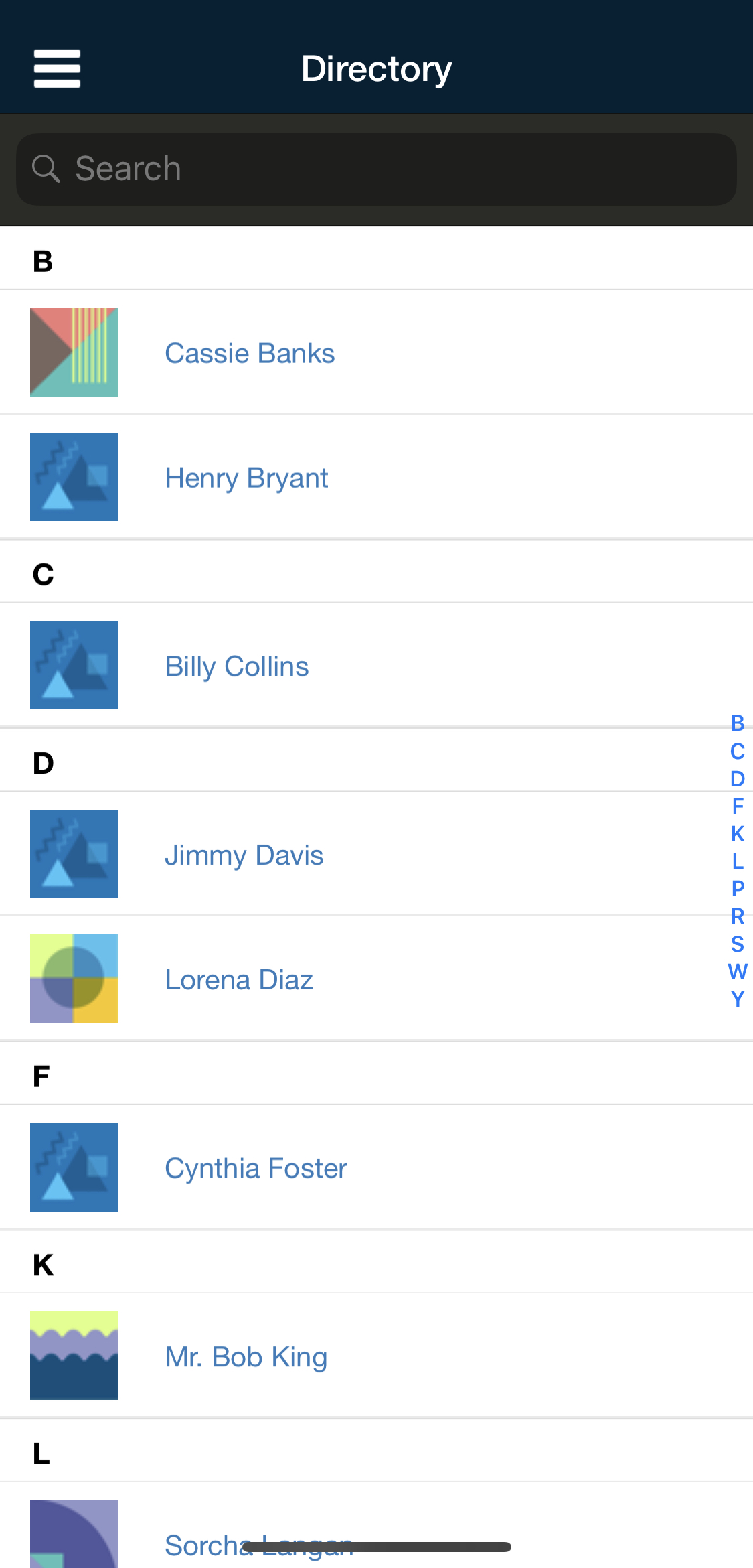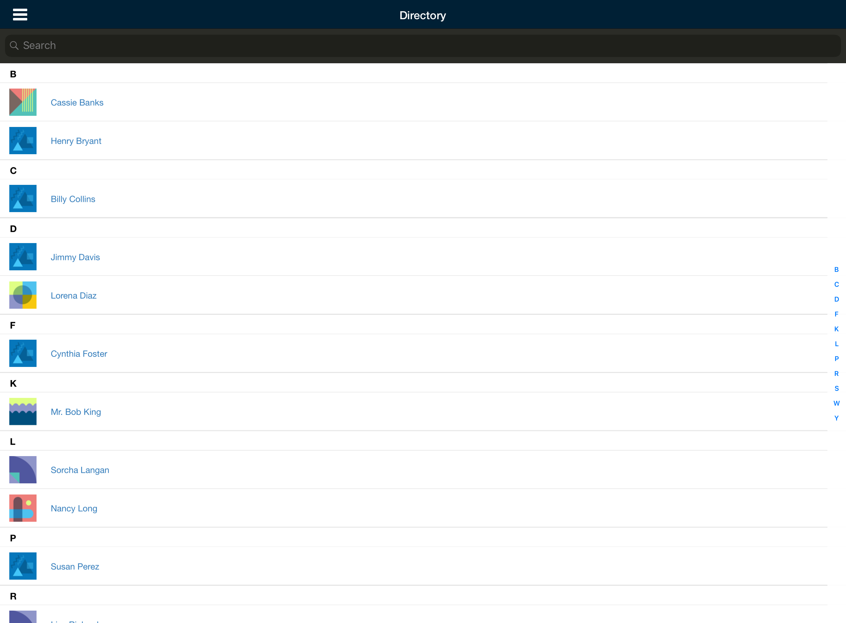 El área Personas le permite ver el directorio del centro educativo. Pulse Directorio para ver una lista de todos los miembros del centro educativo en orden alfabético por apellido. Para ver el perfil de un miembro, simplemente pulse el nombre del usuario.