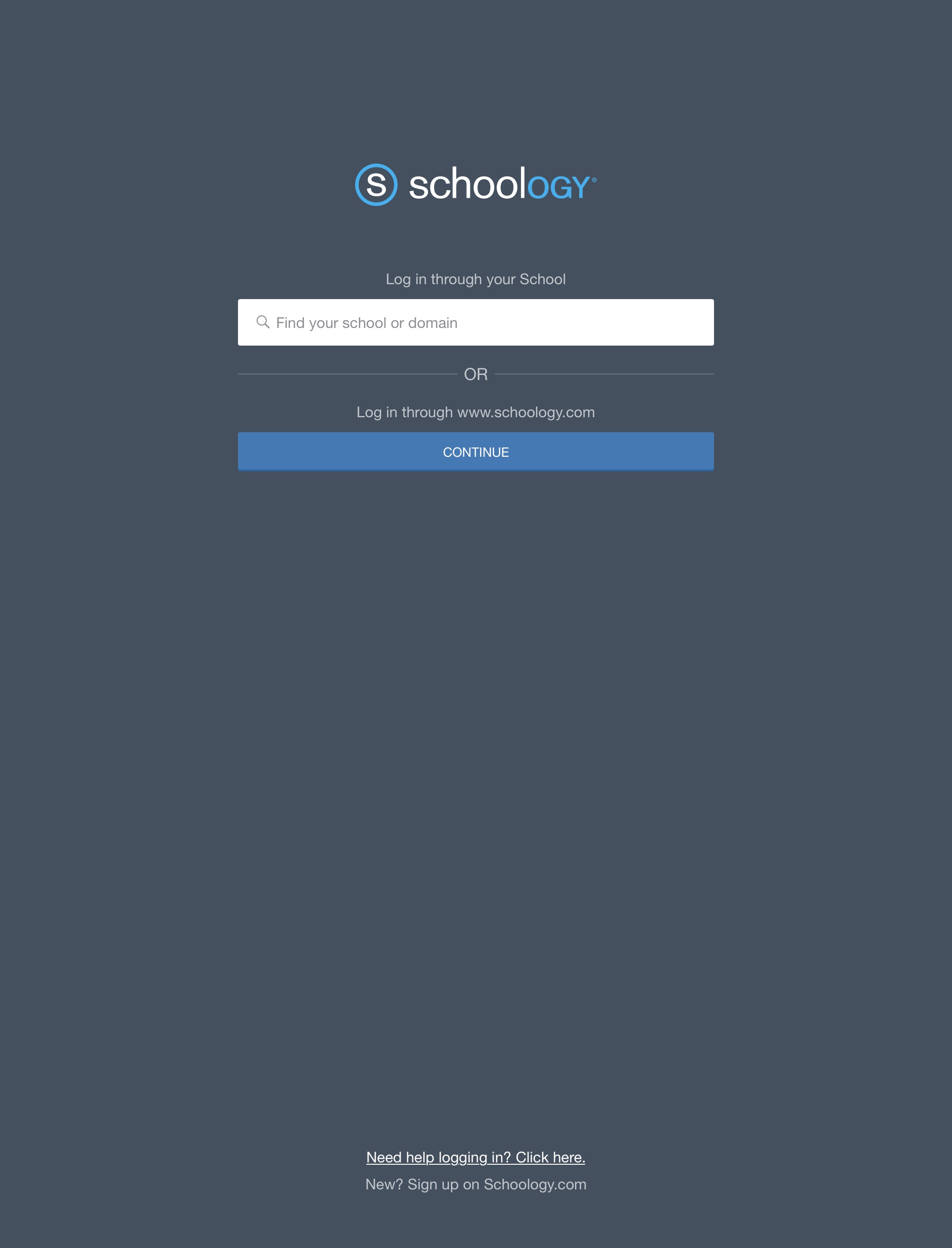 Si usa la versión gratuita de Schoology o no usa las credenciales de inicio de sesión que le proporcionó el centro educativo, use este flujo de trabajo para iniciar sesión en la aplicación iOS.