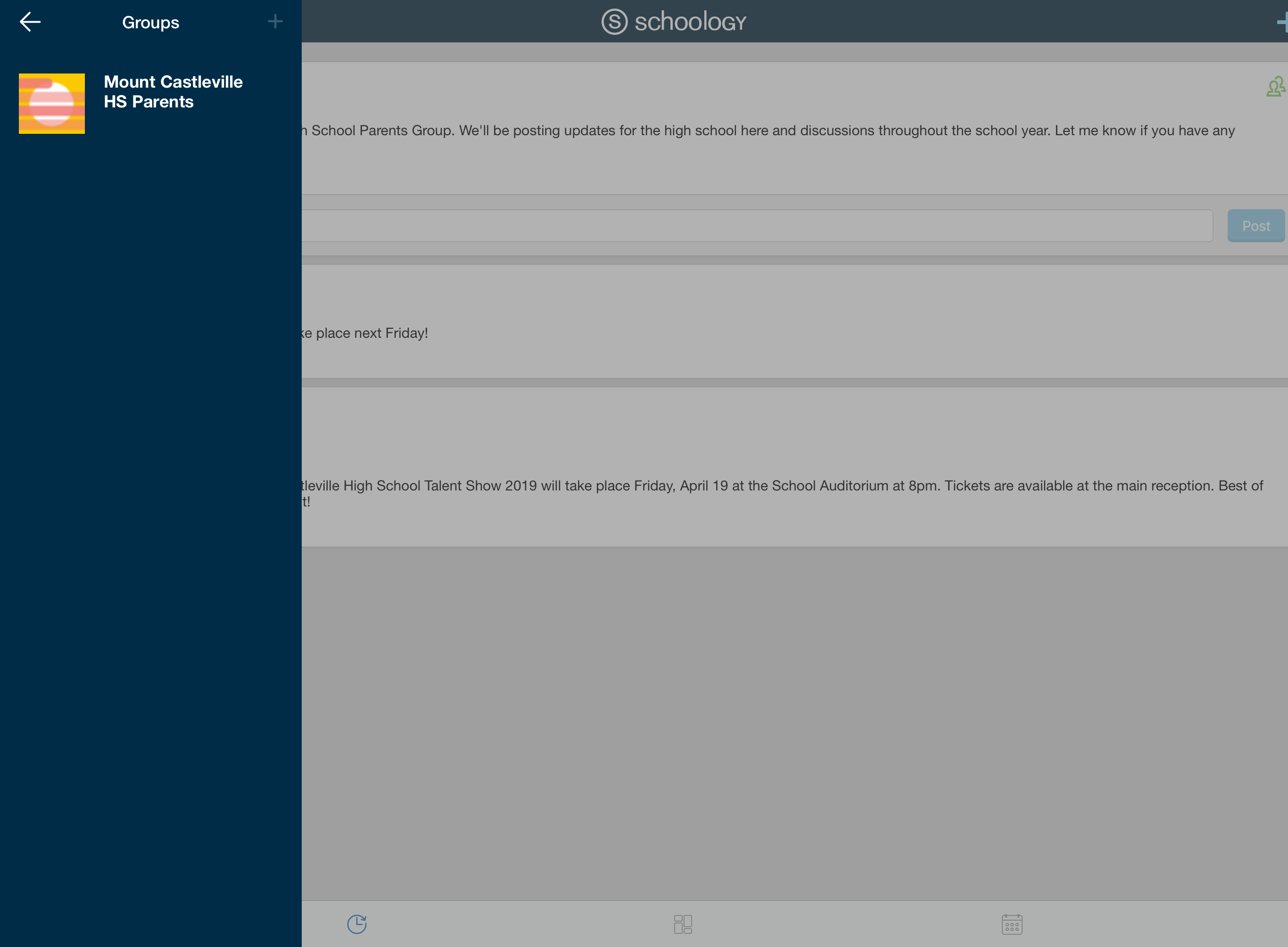 El área Actividad reciente muestra todas las actualizaciones y las publicaciones de blog más recientes que aparecen en la página de inicio de Schoology. Para acceder al área Actividad reciente, pulse el icono de reloj ubicado en la parte inferior de la pantalla Inicio.