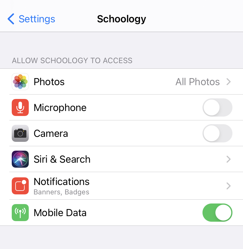 Utilice el área Configuración en su dispositivo para permitir que Schoology acceda a diversas funciones incorporadas como Fotos y Cámara. Si anteriormente denegó el acceso a la cámara o al micrófono, puede cambiar los permisos desde esta área.