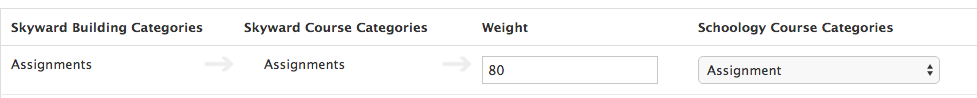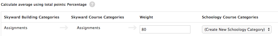 Si marca la opción Basar calificaciones en porcentajes asignados a las categorías en Skyward, las ponderaciones asignadas a cada categoría se transferirán automáticamente a las categorías de Schoology cuando se asignen las categorías en esta pantalla.