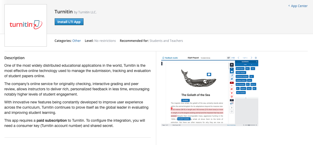 Una vez que haya completado la instalación, consulte Uso de la aplicación TurnItIn LTI para obtener más información sobre cómo usar la aplicación TurnItIn LTI.