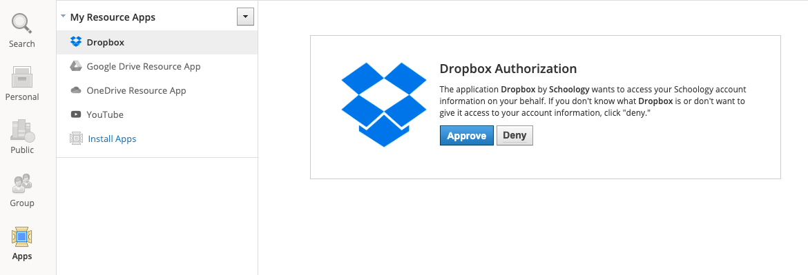 Las aplicaciones instaladas en su cuenta de Schoology suelen solicitar autorización para realizar tareas o permiso para acceder a las áreas de Schoology. Este proceso es necesario para poder usar las aplicaciones de recursos en Schoology.