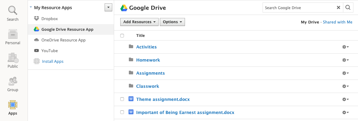 Las aplicaciones de recursos integran contenido externo, como OneDrive, Google Drive o Dropbox, directamente en el Centro de recursos. Esto significa que todos sus recursos de enseñanza personales, compartidos, públicos y externos se consolidan en un mismo lugar.