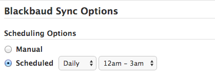 Elija si la sincronización entre Blackbaud y Schoology será manual o programada.