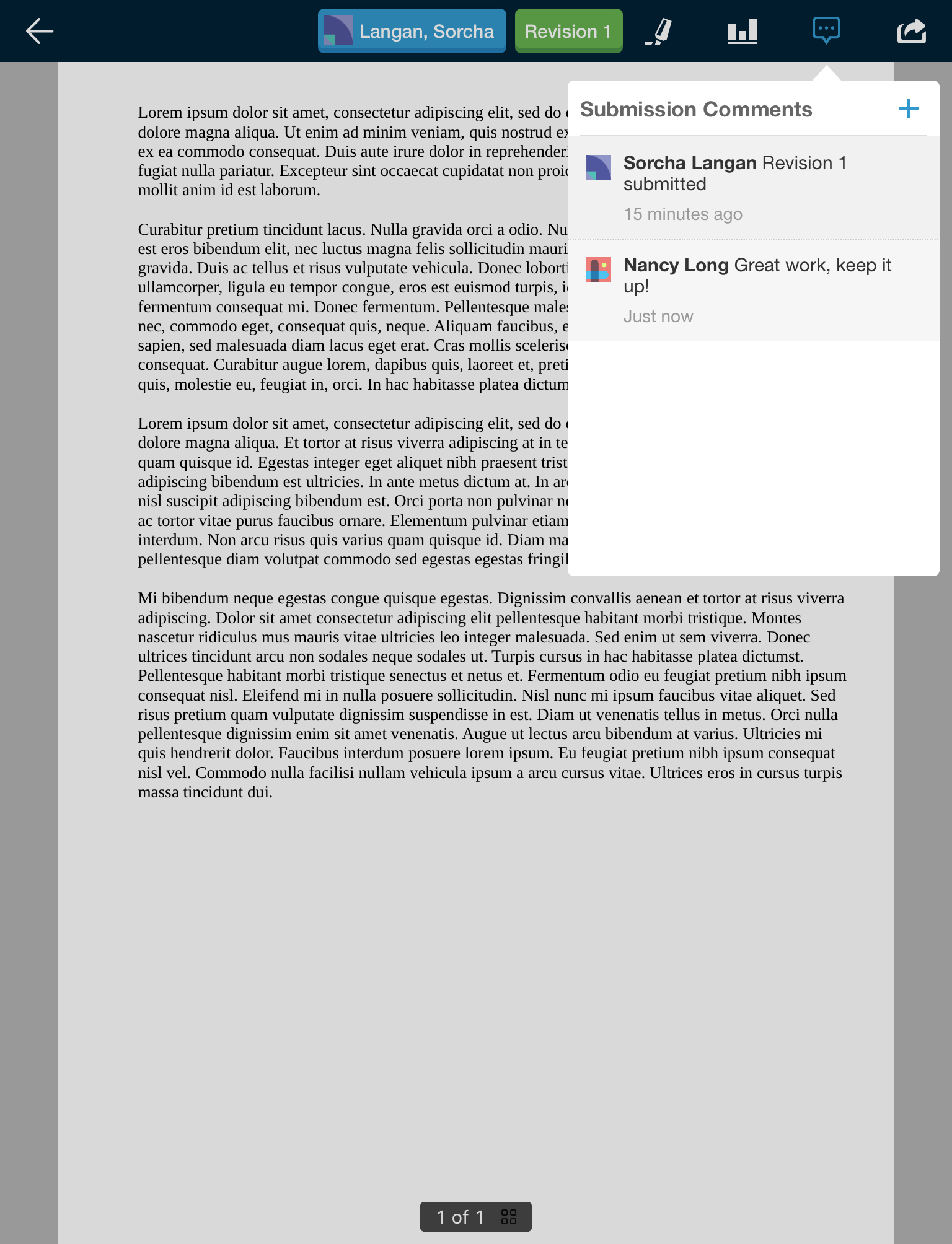 Nota: Si se agregan comentarios en el área Comentarios de entrega, se enviará una notificación al alumno y al instructor. Si se agregan notas en el documento en sí a través de las herramientas de anotaciones en el panel de calificaciones, no se enviará una notificación.