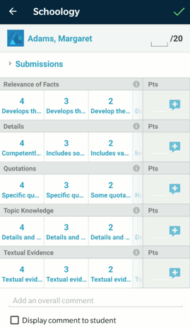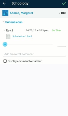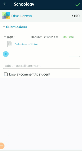 Para calificar una entrega, utilice el deslizador para ajustar la puntuación numérica o ingrese una puntuación al pulsar el campo y utilizar el teclado de su dispositivo. Pulse la marca de verificación verde situada en la esquina superior derecha para guardar la calificación.