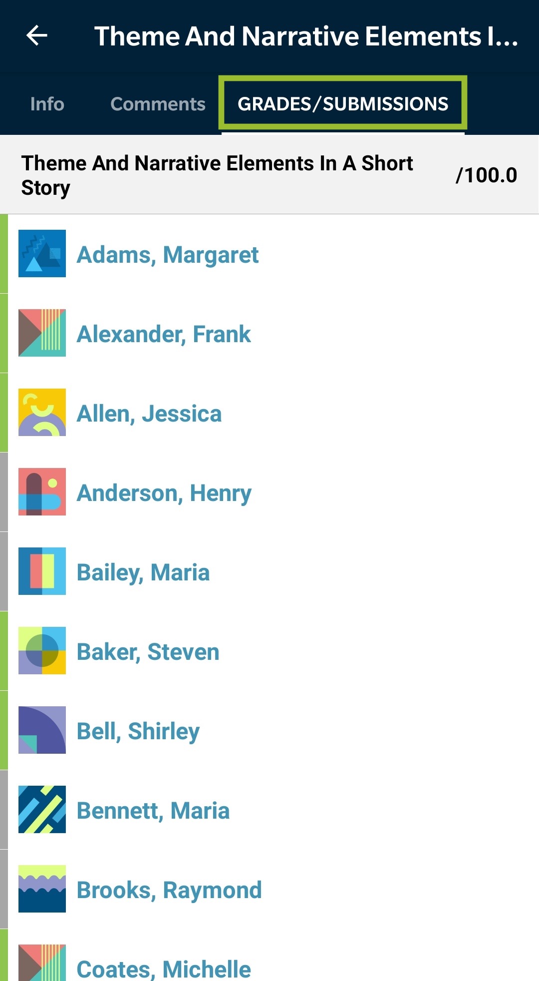 Para acceder al panel de calificaciones, abra una tarea y pulse Calificaciones/entregas desde la barra de navegación. Elija el nombre de un alumno de la lista para acceder a su entrega.