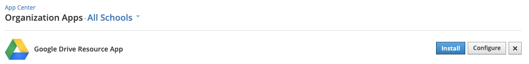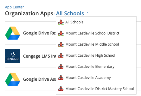 Si desea instalar una aplicación para todos los campus y establecer una configuración diferente para un campus específico (por ejemplo, si desea instalar una aplicación solo para los administradores del curso en una escuela intermedia e instalar dicha aplicación para todos los usuarios en una escuela secundaria), deberá realizar estos cambios dentro del campus específico. Utilice el menú desplegable Todos los centros educativos en Aplicaciones de la organización para alternar entre los diferentes campus de la organización y realizar los cambios desde allí: