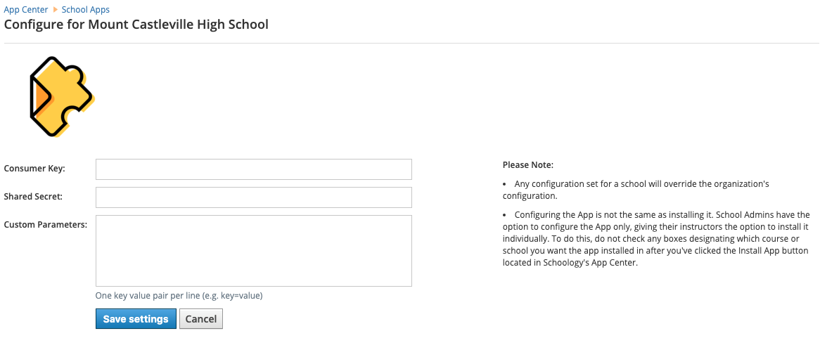 En general, las aplicaciones incluidas en el Centro de aplicaciones se instalan y configuran en Schoology a nivel del distrito y no pueden configurarse por separado para cada campus. No obstante, algunas aplicaciones LTI exigen que cada centro educativo o campus posea sus propias credenciales de acceso cuando la licencia no se distribuye a nivel del distrito. Los administradores del sistema pueden configurar las aplicaciones LTI para centros educativos específicos en su organización; para esto, deben seguirse los siguientes pasos: