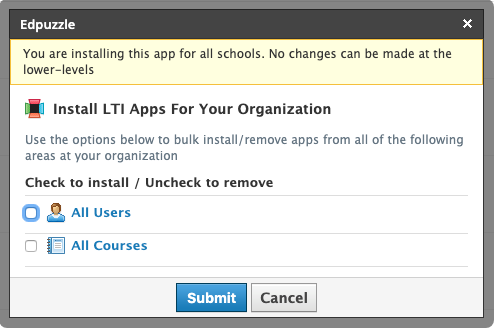 Según la aplicación, tendrá la opción de realizar la instalación para Todos los usuarios, Todos los cursos, Solo para administradores del curso o Todos los miembros del curso, o Todos los grupos. Marque las casillas de las áreas o los miembros para los cuales desea instalar la aplicación. Si modifica la configuración de la instalación a nivel del distrito, no podrá modificarse a nivel del campus.