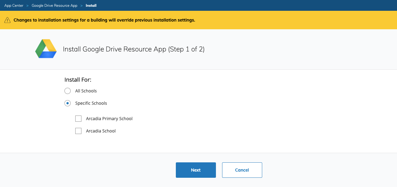 No. Si instala una aplicación para todos los campus en su organización (desde la vista Todos los centros educativos en Aplicaciones de la organización), no podrán realizarse cambios individuales al nivel del campus. Al realizar la instalación al nivel del distrito, se mostrará el siguiente mensaje: