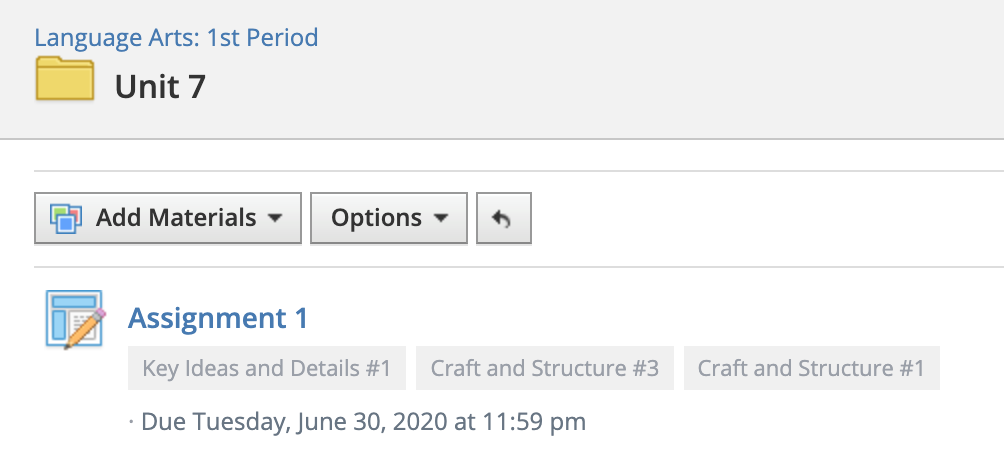 Puede consultar los objetivos que haya seleccionado como etiquetas debajo del material en la vista de materiales del curso, o debajo del botón de alinear cuando edite el material. Puede agregar o quitar las alineaciones en cualquier momento.