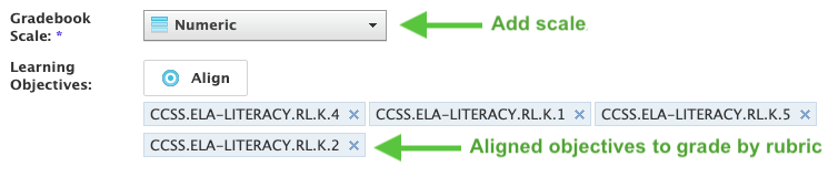 También debe seleccionar una Escala de la libreta de calificaciones para el material para determinar la puntuación para el material en el libro de calificaciones del curso . Puede seleccionar la misma escala que tiene su distrito como la Escala de calificación de desempeño , o puede elegir una escala aparte, como la escala Numérica predeterminada.