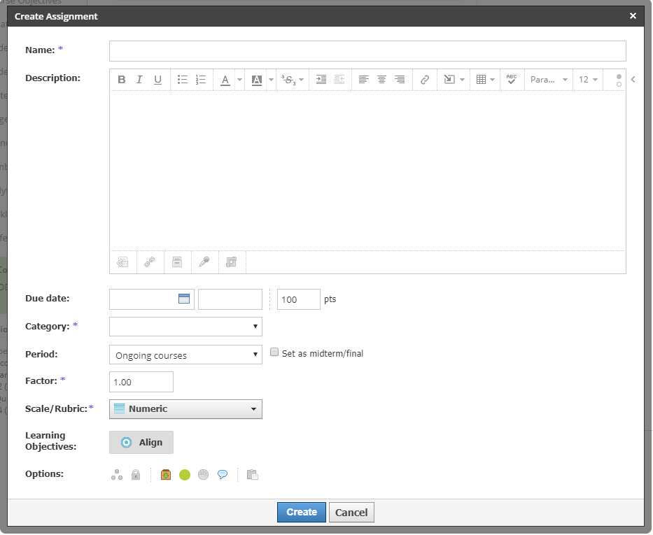 Este es un flujo de trabajo diferente de las rúbricas existentes que se pueden crear, editar y administrar en el área Configuración de calificaciones del curso. No puede usar una rúbrica existente junto con un material que esté alineado con los objetivos del distrito.