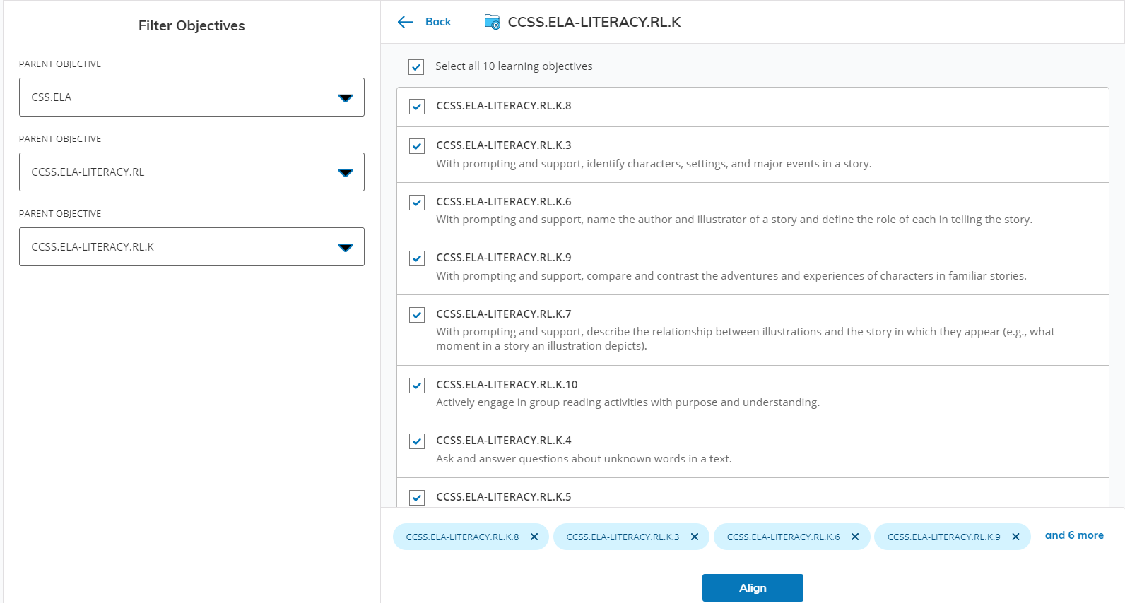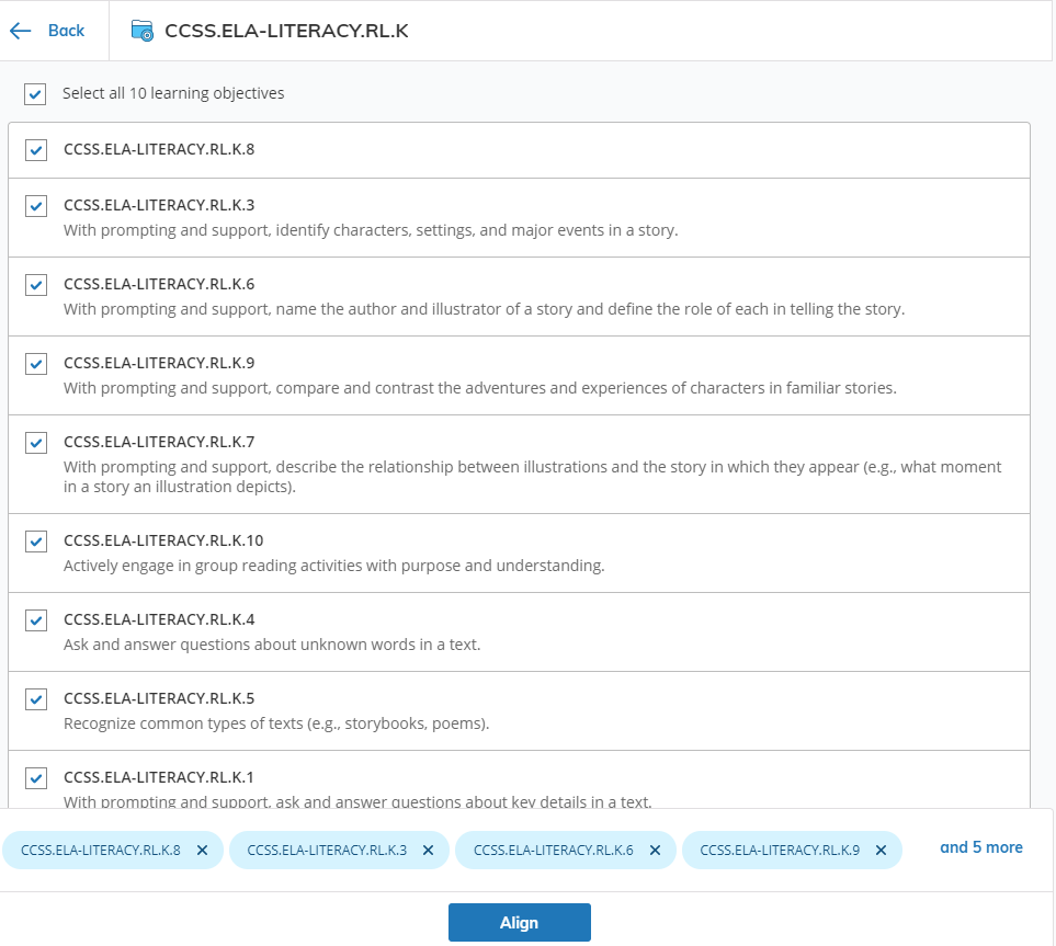 Una vez que haya seleccionado todos sus objetivos de aprendizaje, haga clic en Alinear. Esto alineará sus objetivos de aprendizaje seleccionados con el material.