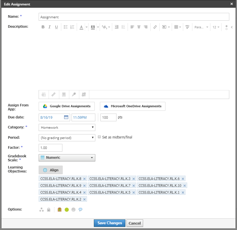 Si ha alineado los materiales del curso con los objetivos de aprendizaje de la biblioteca de su distrito, se generará automáticamente una vista de clasificación de rúbrica para ese material. La rúbrica se creará en función de los objetivos alineados y no se puede compartir ni copiar en otros materiales.