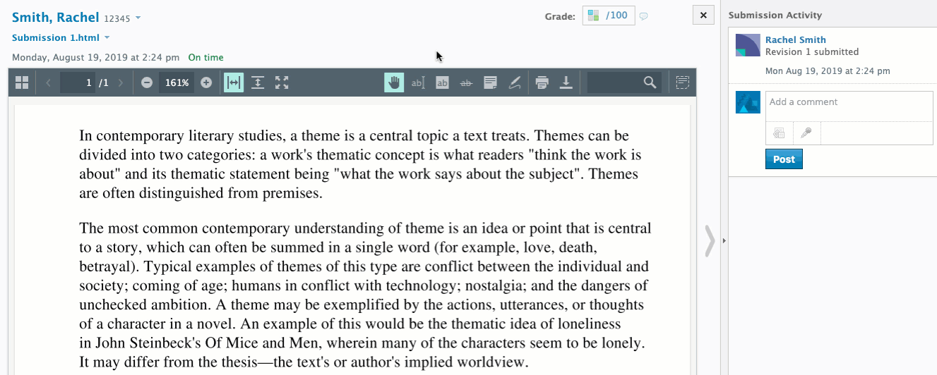 Cuando califique las entregas de los alumnos, puede utilizar la vista de rúbrica para ingresar una puntuación por cada objetivo del distrito alineado: