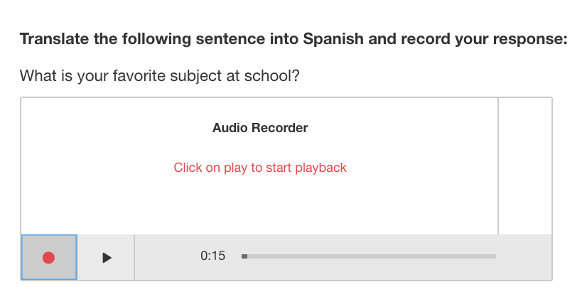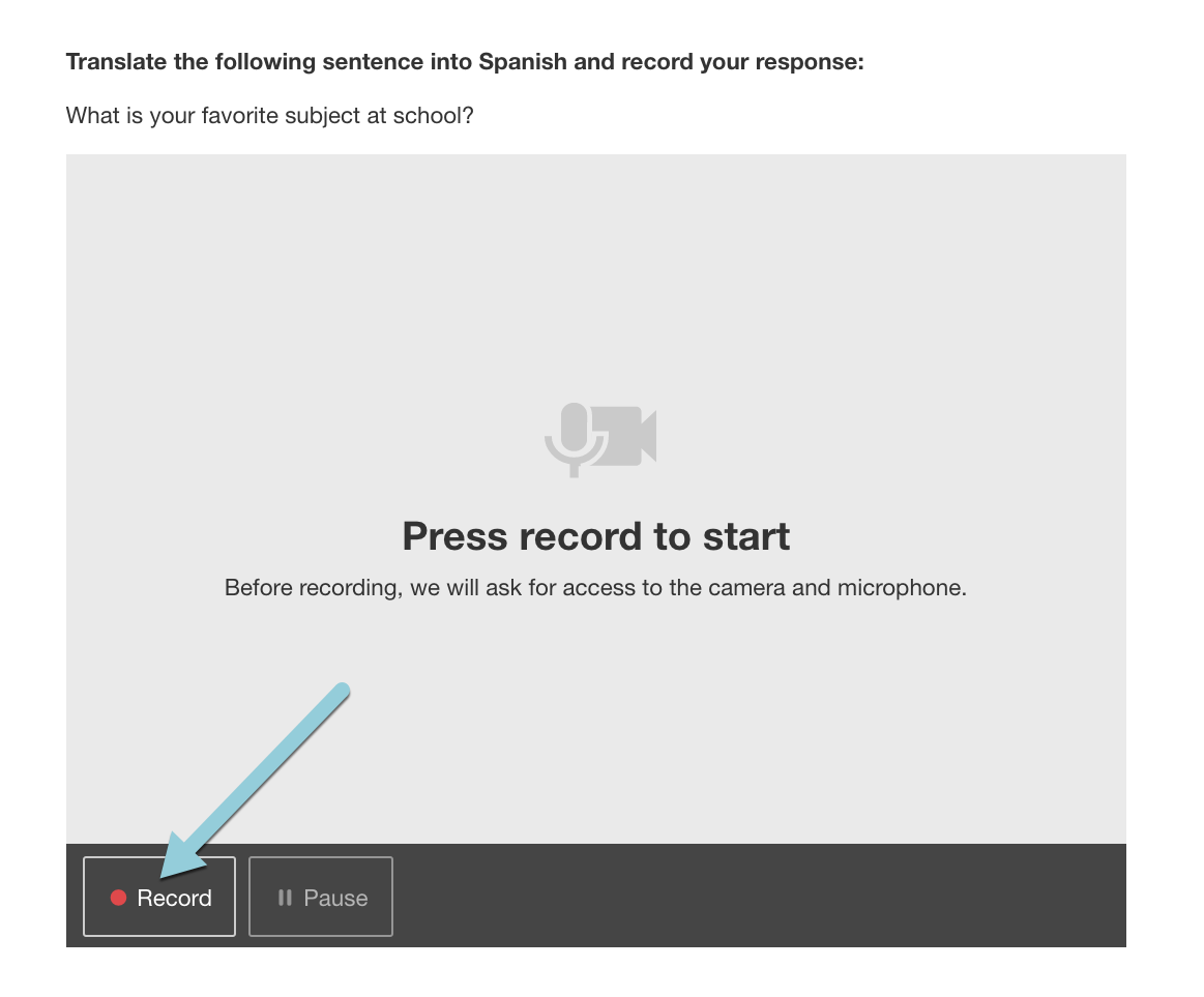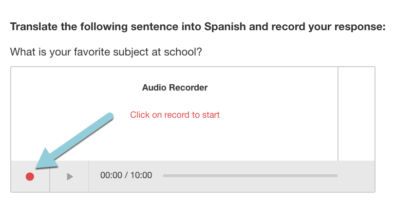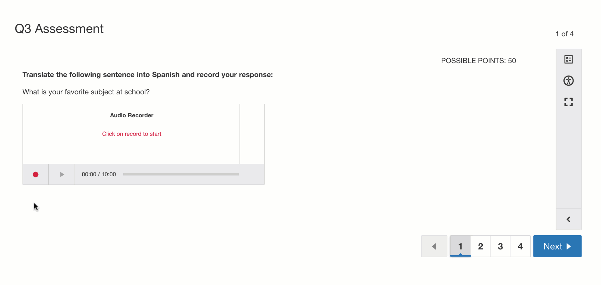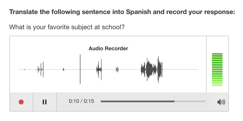 Los instructores pueden incluir una pregunta de audio o video en una evaluación para que usted pueda grabar archivos de audio o video directamente dentro de la evaluación y incluirlos en su entrega.