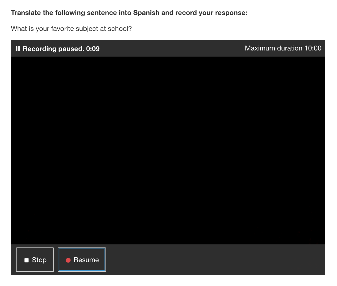 La grabación comenzará cuando finalice la cuenta regresiva. Puede pausar y reanudar la grabación en cualquier momento. Las grabaciones de video pueden durar 10 minutos como máximo. También es posible que su instructor haya configurado un límite de tiempo inferior a este. El límite de tiempo se muestra en la esquina superior derecha de la pantalla de grabación.