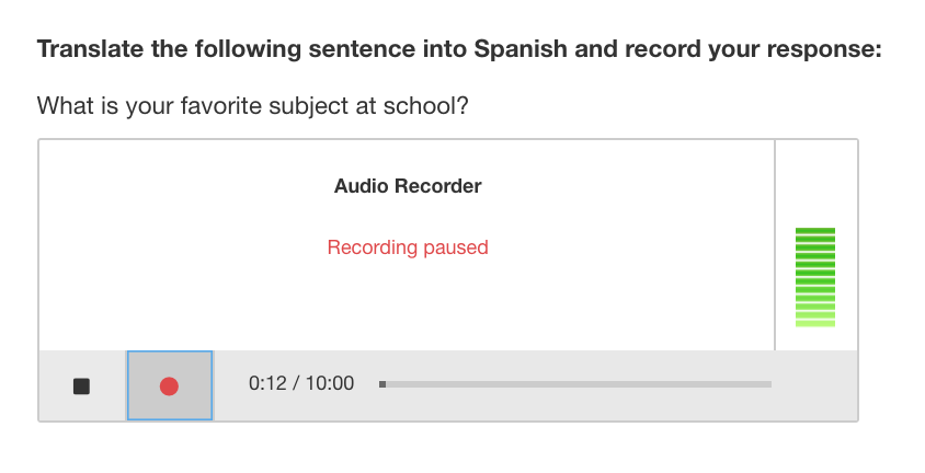 Puede pausar y reanudar la grabación en cualquier momento. Las grabaciones de audio pueden durar 10 minutos como máximo. También es posible que su instructor haya configurado un límite de tiempo inferior a este.