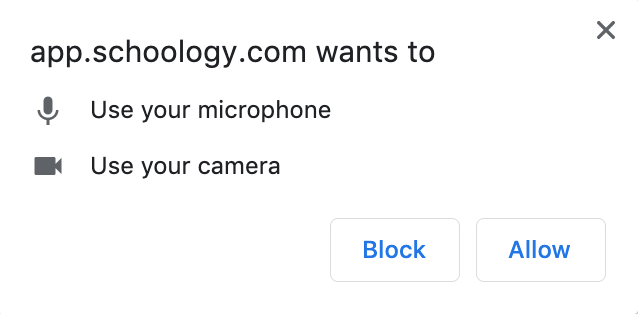 Dependiendo de la configuración de su navegador, quizás se le pida que habilite el micrófono y la cámara. Haga clic en Permitir para continuar con la grabación: