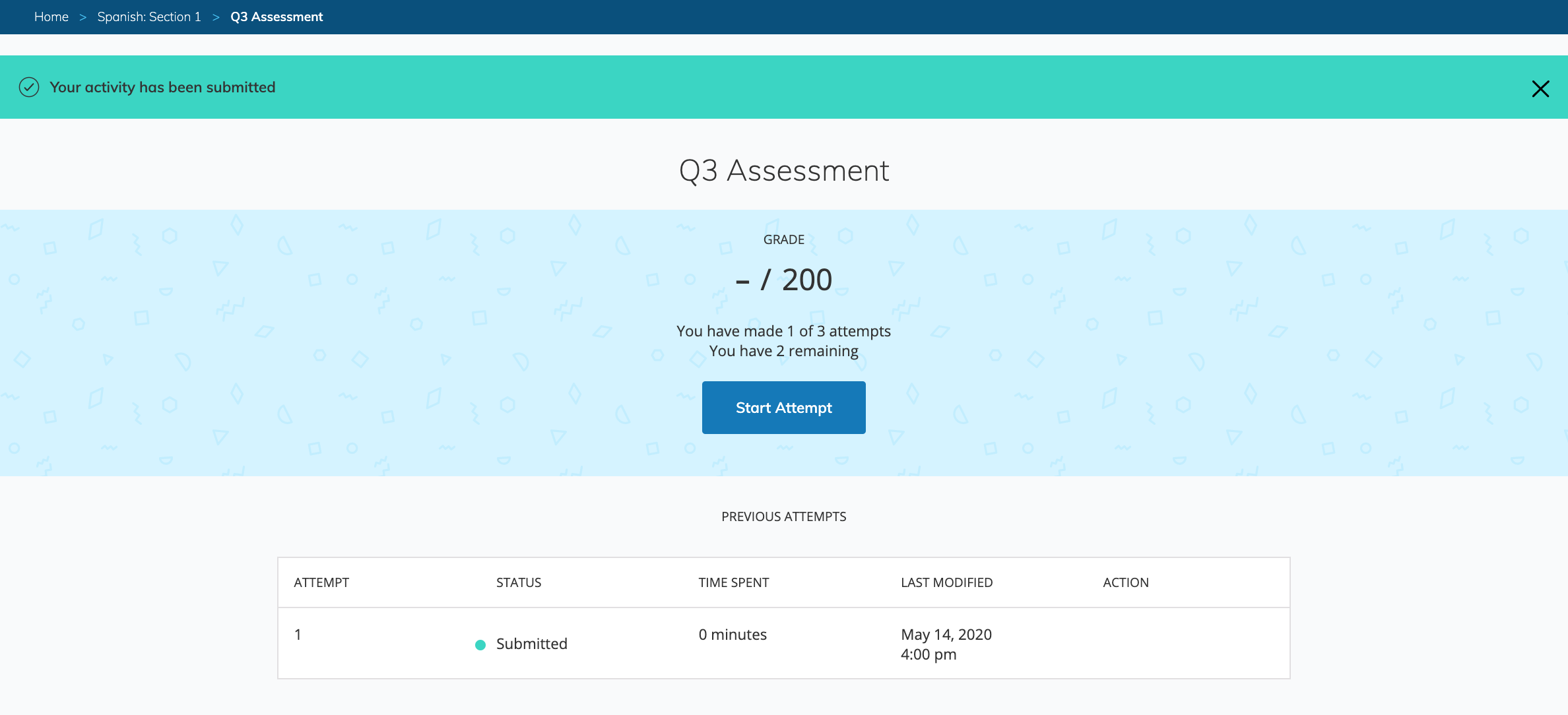 Debido a que las preguntas de audio y video son tipos de preguntas subjetivas, sus calificaciones no se muestran automáticamente. Las calificaciones de las evaluaciones completadas con estos tipos de preguntas subjetivas aparecerán en la sección Calificaciones una vez que el instructor revise la entrega e introduzca una puntuación.