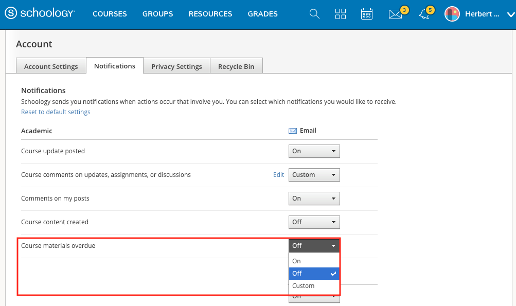 Para recibir notificaciones electrónicas o por mensaje de texto por materiales atrasados, los miembros del curso pueden habilitar la opción Materiales del curso atrasados en el área Notificaciones. Seleccione Activado en el menú desplegable para recibir notificaciones por los materiales atrasados en todos los cursos, o seleccione Personalizar y elija los cursos por los cuales desea recibir notificaciones de atrasos.