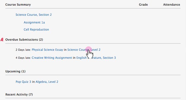 Los padres pueden ver una lista de todas las tareas, los foros y los cuestionarios o las pruebas atrasados del alumno en la misma área Atrasados que se encuentra en la parte derecha de la pantalla.