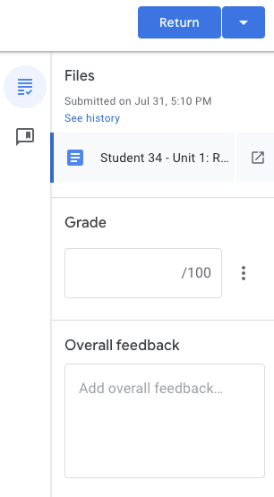 Una vez que un alumno empieza a trabajar en una tarea de Google, la propiedad del archivo se transfiere automáticamente al alumno. Cuando recibe entregas, se le restaura a usted el acceso para editar. Cuando devuelve una tarea, el alumno recibe el acceso para editar.