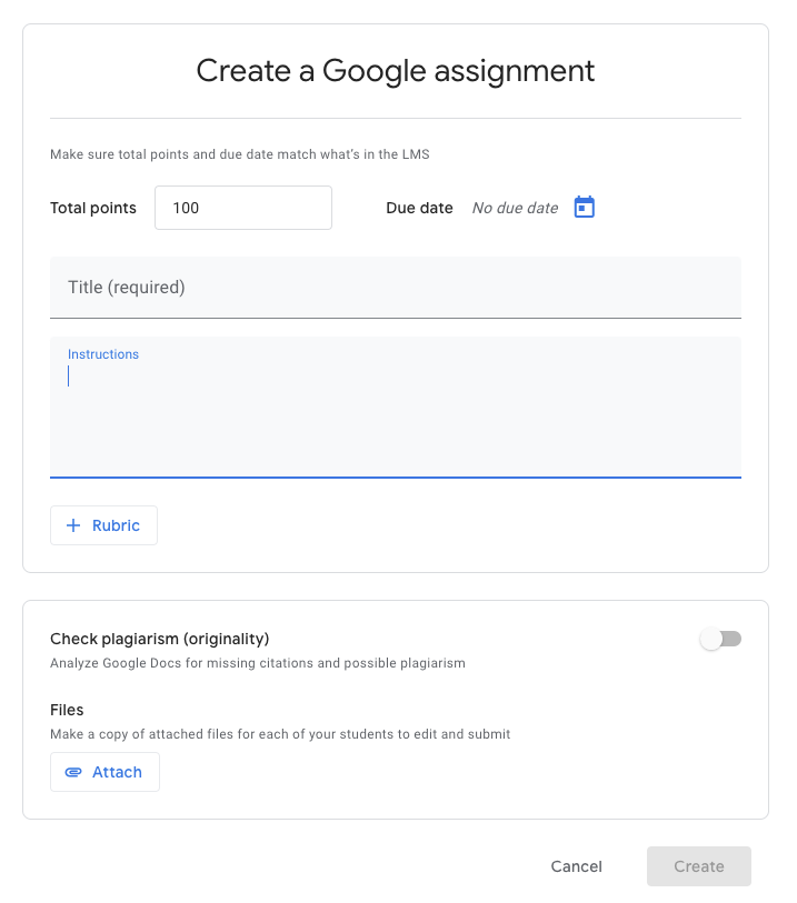 Opcional: seleccione una rúbrica en el menú desplegable. Solo se admiten las rúbricas creadas en la aplicación Tareas de Google. Las rúbricas creadas en la cuenta de Schoology no pueden adjuntarse a una tarea de Google.