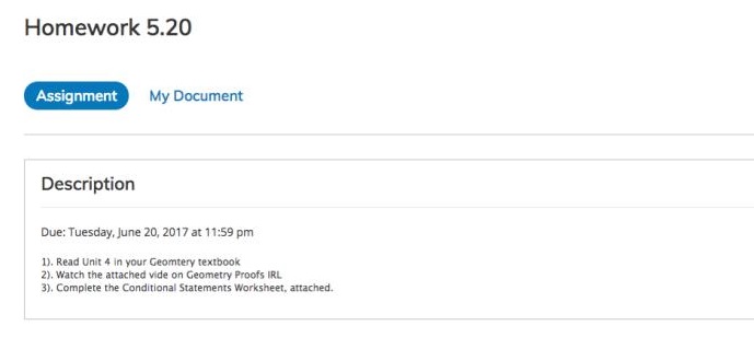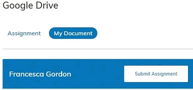Los alumnos tienen acceso a dos pestañas que se muestran en la parte superior de la tarea: Tarea y Mi documento. Al hacer clic en la pestaña Mi documento se generará una copia del documento original que luego será compartida entre usted (el instructor) y el alumno. Este archivo copiado luego se ubicará y organizará en su drive.