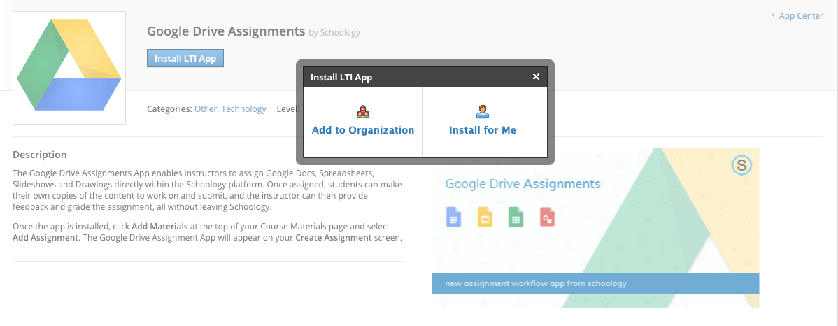 Para usar Tareas de Google Drive, usted o el administrador del sistema deben instalar la aplicación desde el Centro de aplicaciones de Schoology, al cual se puede acceder a través del encabezado.