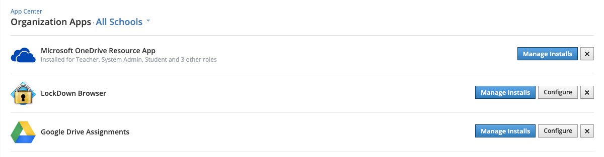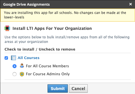 Si usted es el administrador del sistema y está instalando la aplicación para su organización, instale la aplicación para Todos los cursos; para realizar esto, primero debe seleccionar Agregar a organización, después de haber hecho clic en Instalar aplicación LTI. No necesita una clave de consumidor y un secreto compartido para la aplicación Tareas de Google Drive.