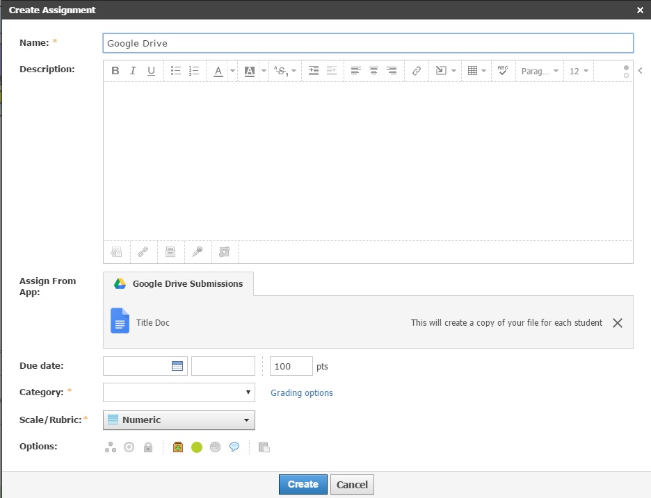 Complete el resto de la tarea y haga clic en Crear para finalizar. Tenga en cuenta que al hacer clic en Crear, no podrá eliminar el archivo de Google seleccionado en la tarea.