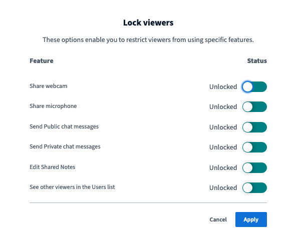 Durante una conferencia, los administradores pueden bloquear algunas funciones de la conferencia para impedir que los miembros puedan usarlas.